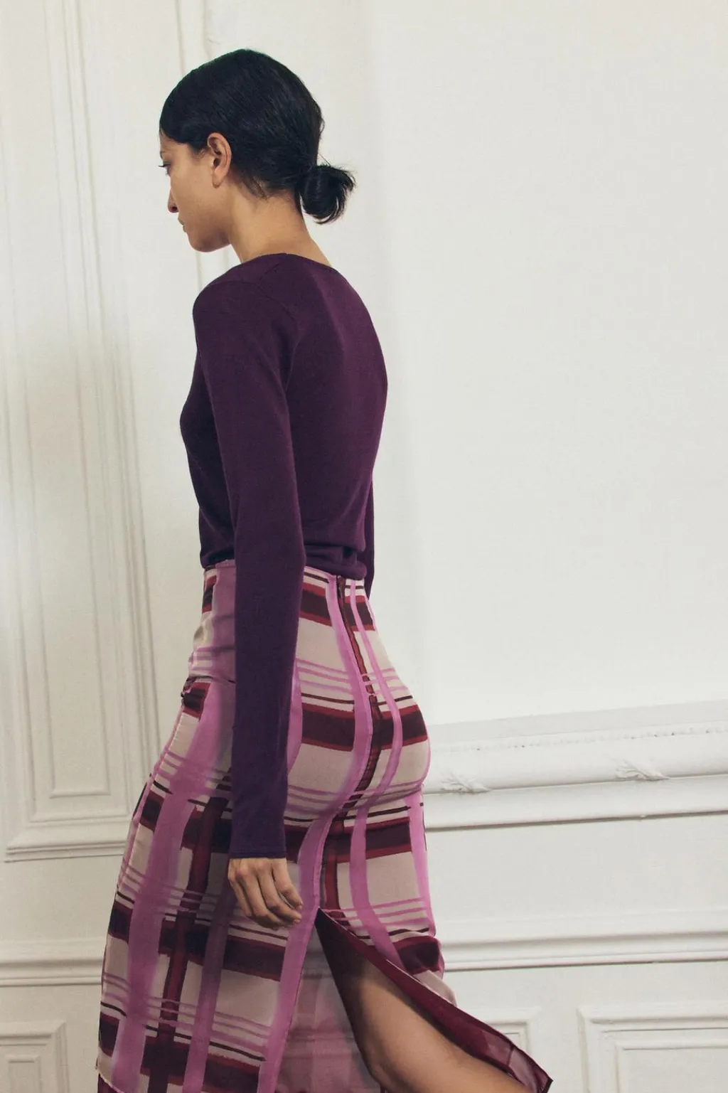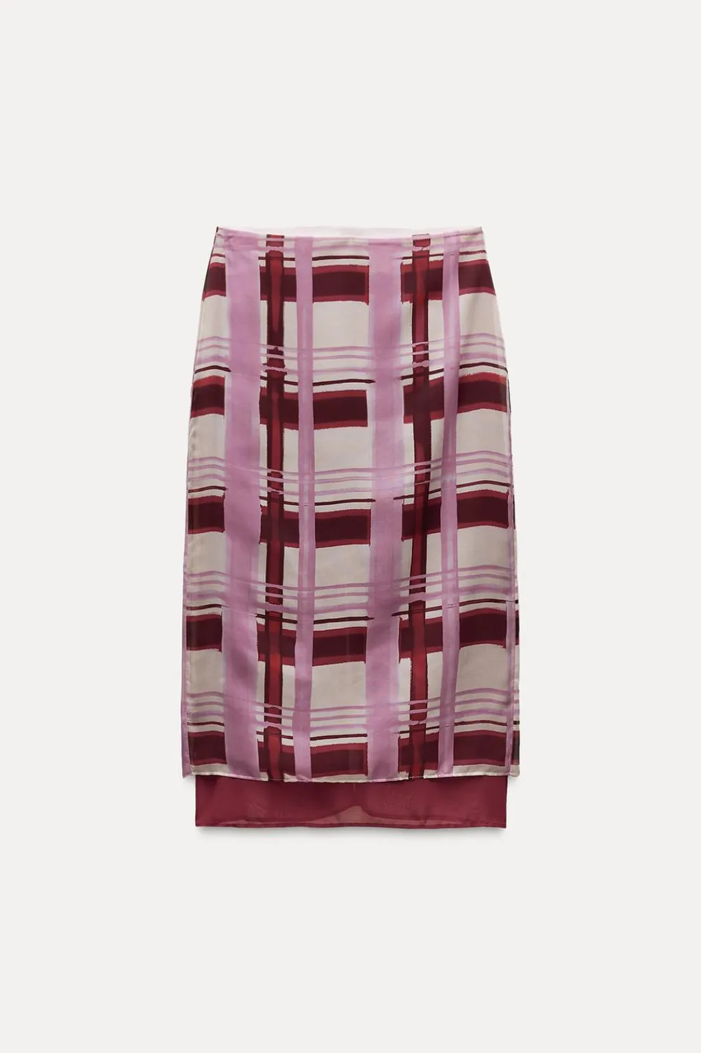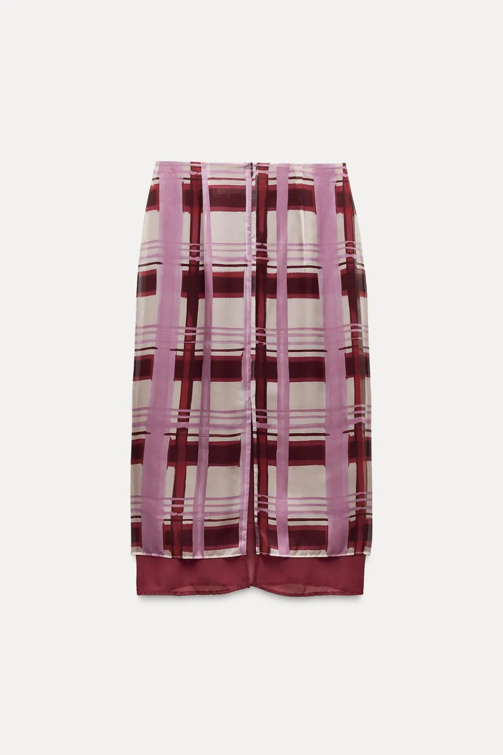 Falda de tiro alto con cremallera en espalda oculta en costura. Bajo con abertura en espalda.