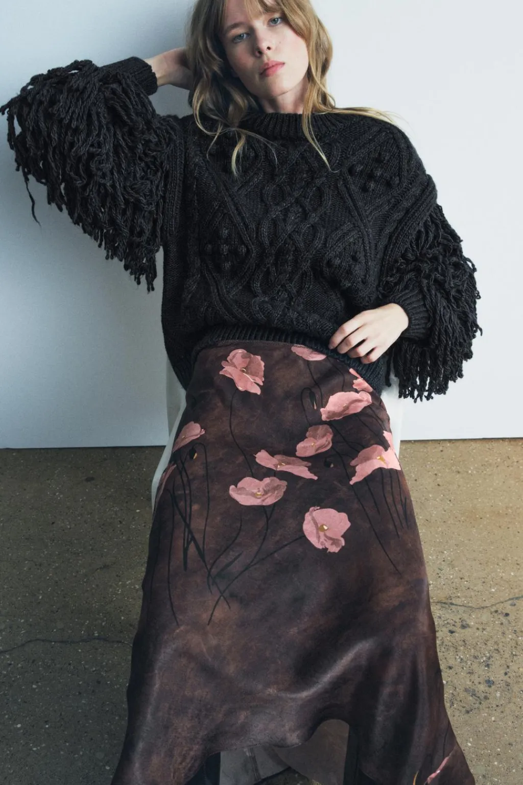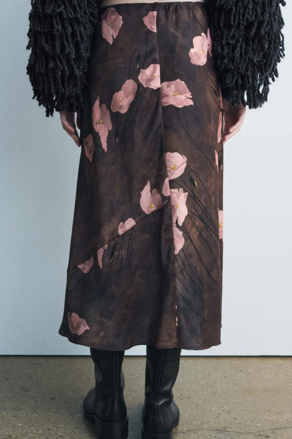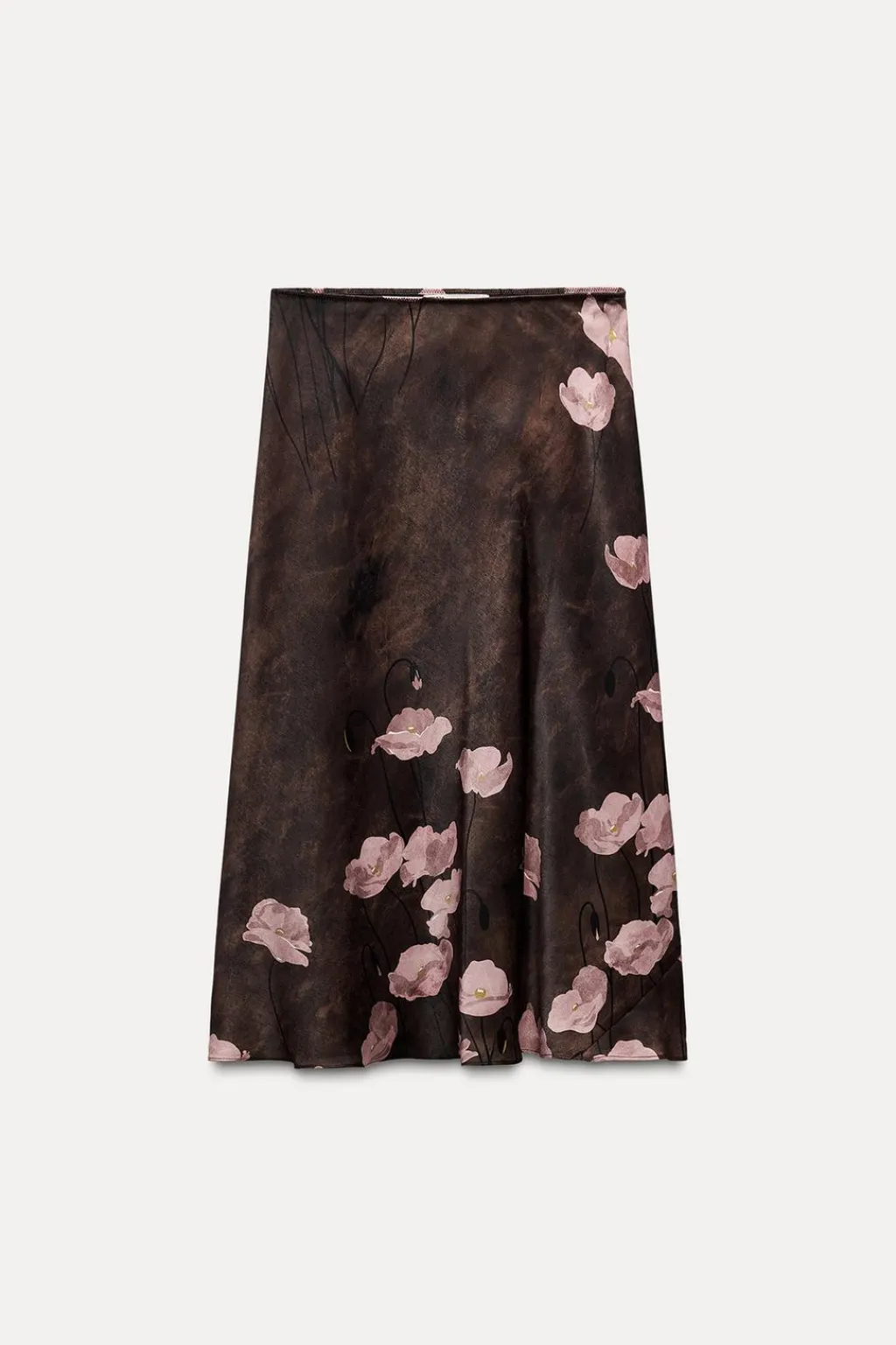 Falda midi de tiro alto. Detalle de estampación de flores a contraste. Bajo acabado en línea evasé. Cierre con cremallera oculta en costura.