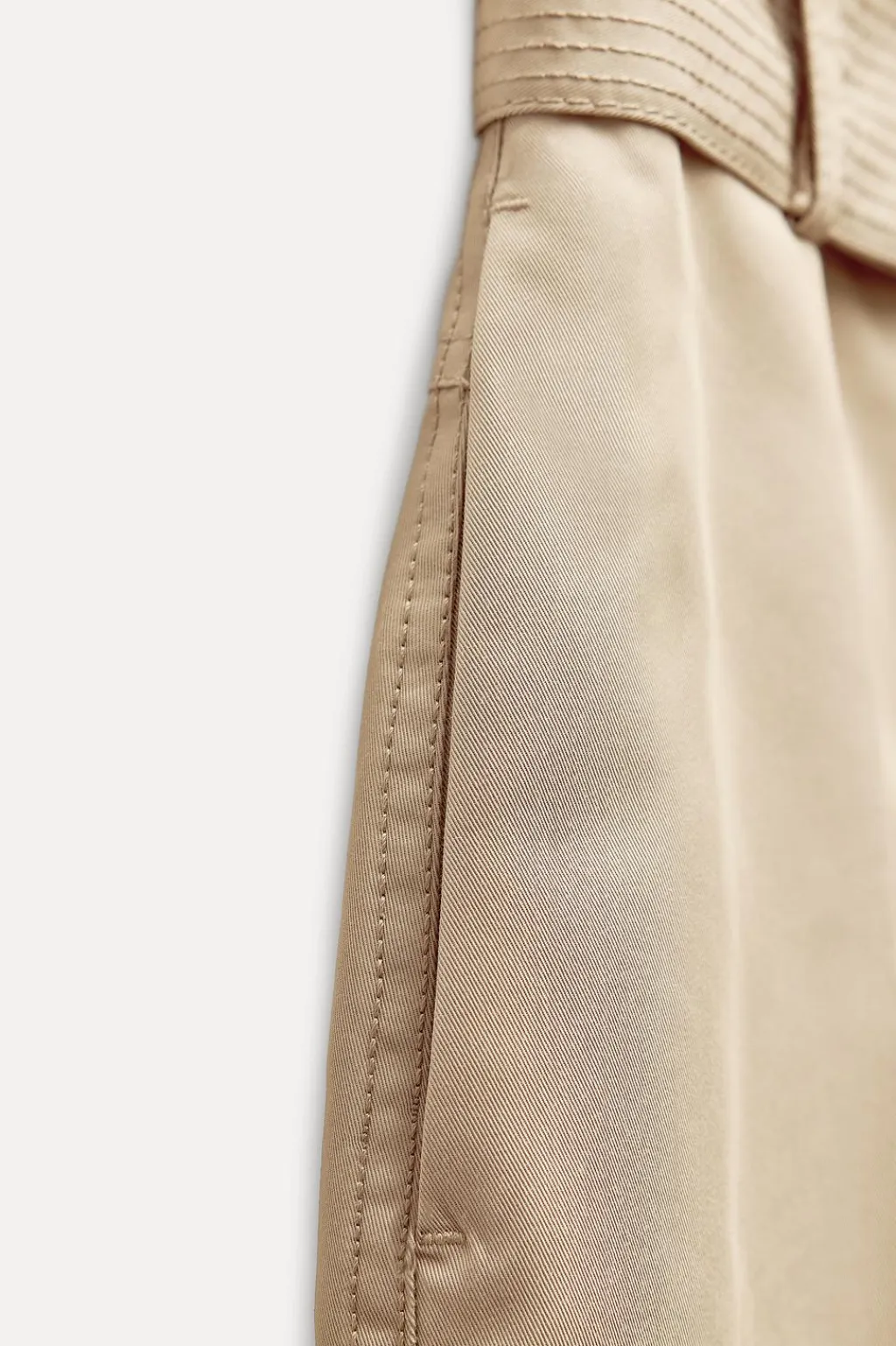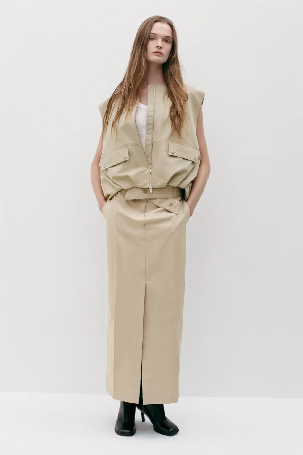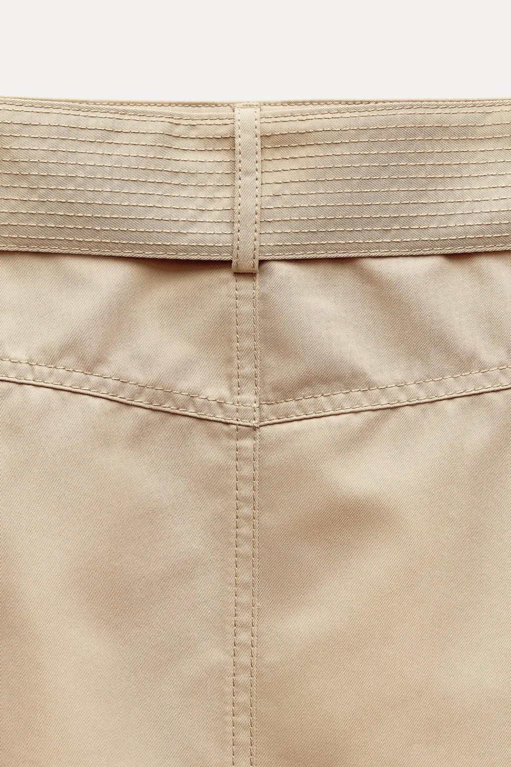 Falda midi confeccionada en tejido tipo gabardina. Tiro medio y cintura con trabillas. Cinturón en mismo tejido ajustable con botones. Bolsillos laterales ocultos en costura. Bajo acabado en abertura. Cierre frontal con cremallera y botón.