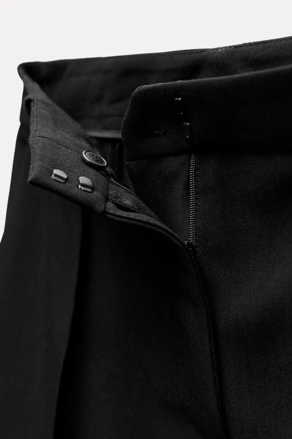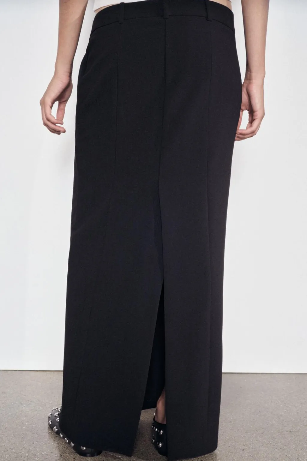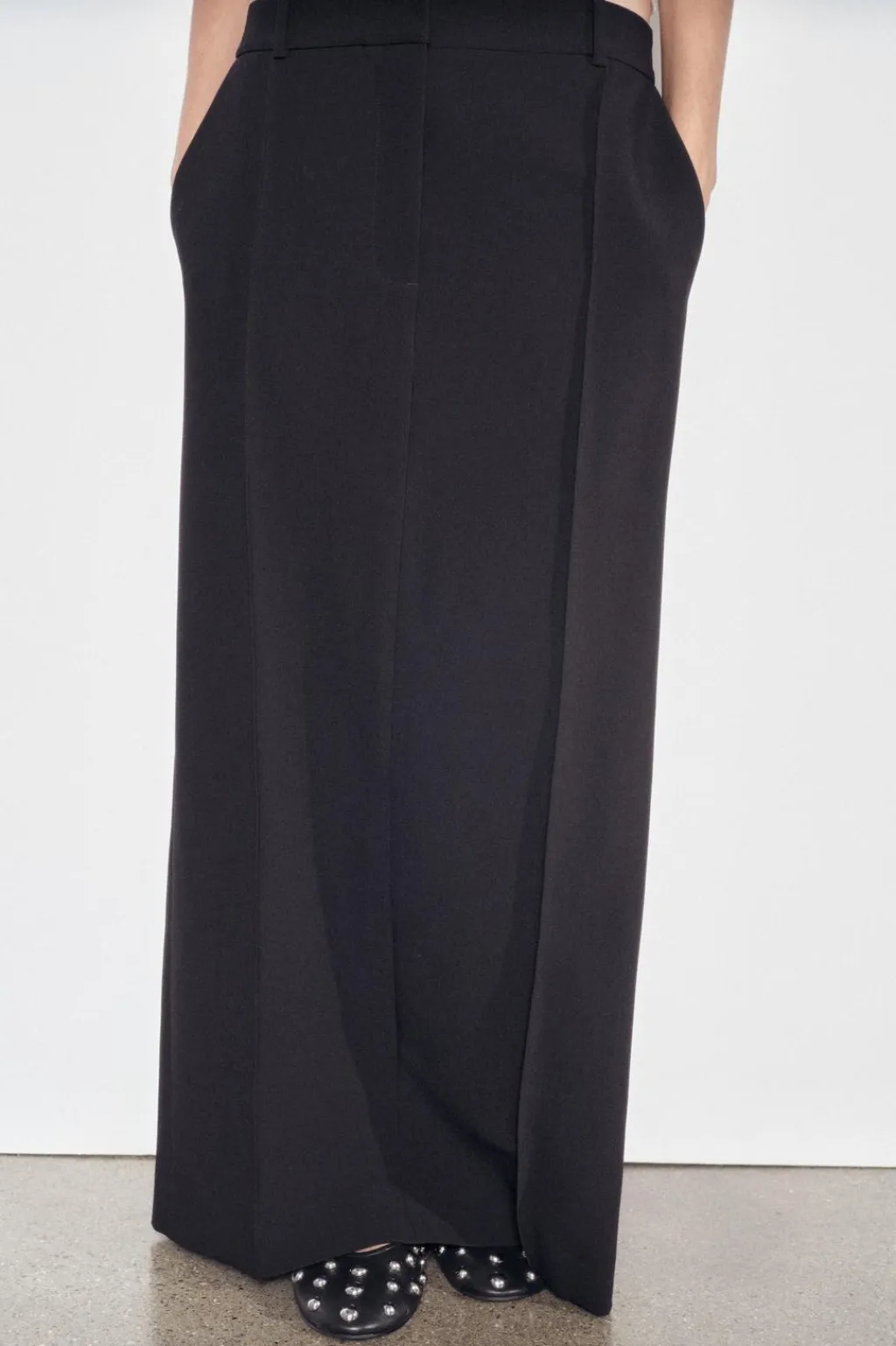 Falda larga de tiro bajo y cintura con trabillas. Bolsillos delanteros. Bajo acabado con abertura en espalda. Cierre frontal con cremallera, botón y gancho metálico.