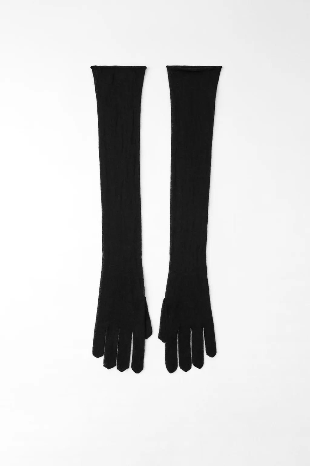 Guantes largos semitransparentes confeccionados en hilatura de lana 100%.