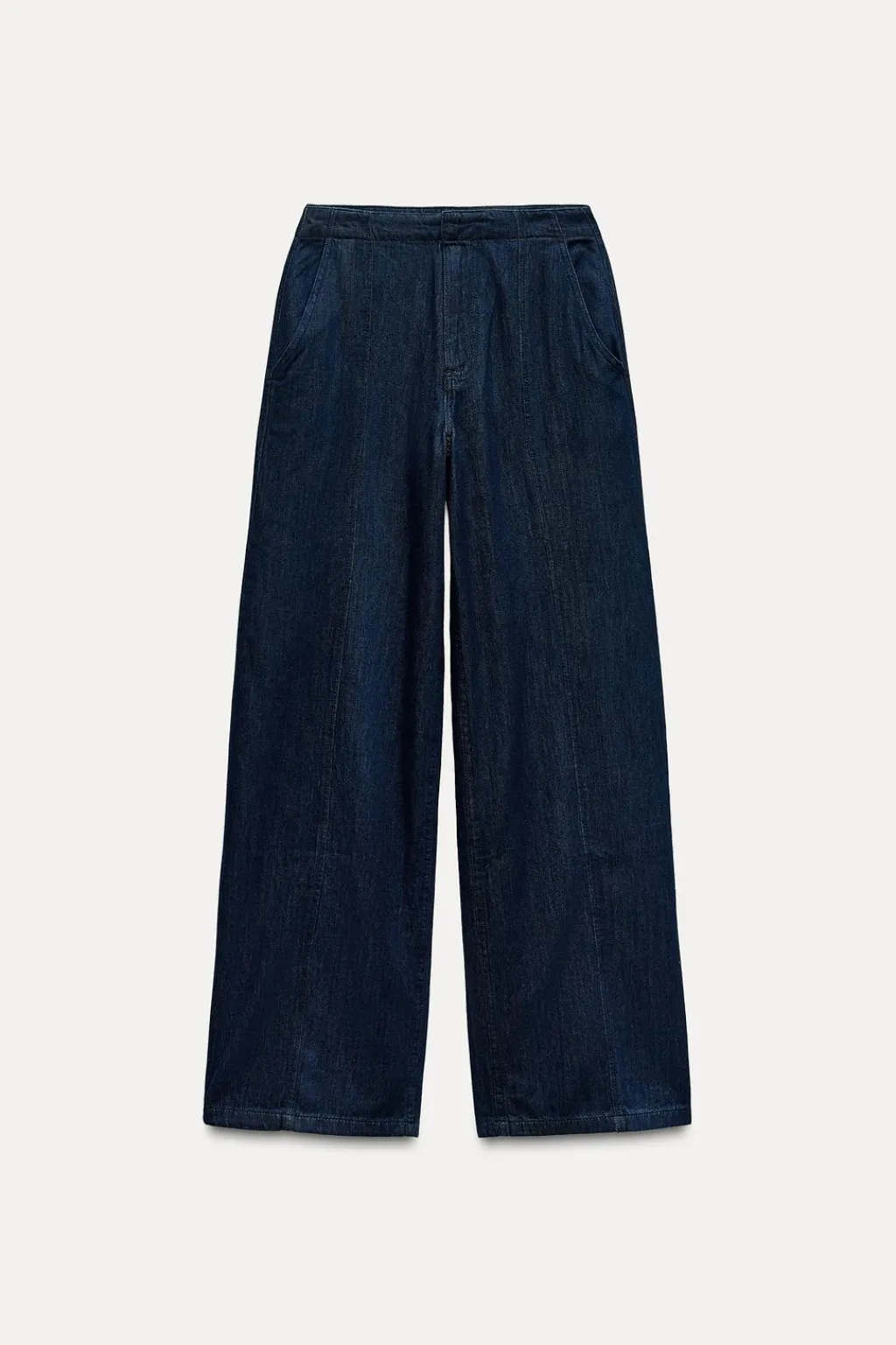 Jeans de tiro alto. Bolsillos laterales y de plastrón en espalda. Detalle de costura marcada en delantero. Pierna ancha. Cierre frontal con cremallera, botón interior y gancho metálico.