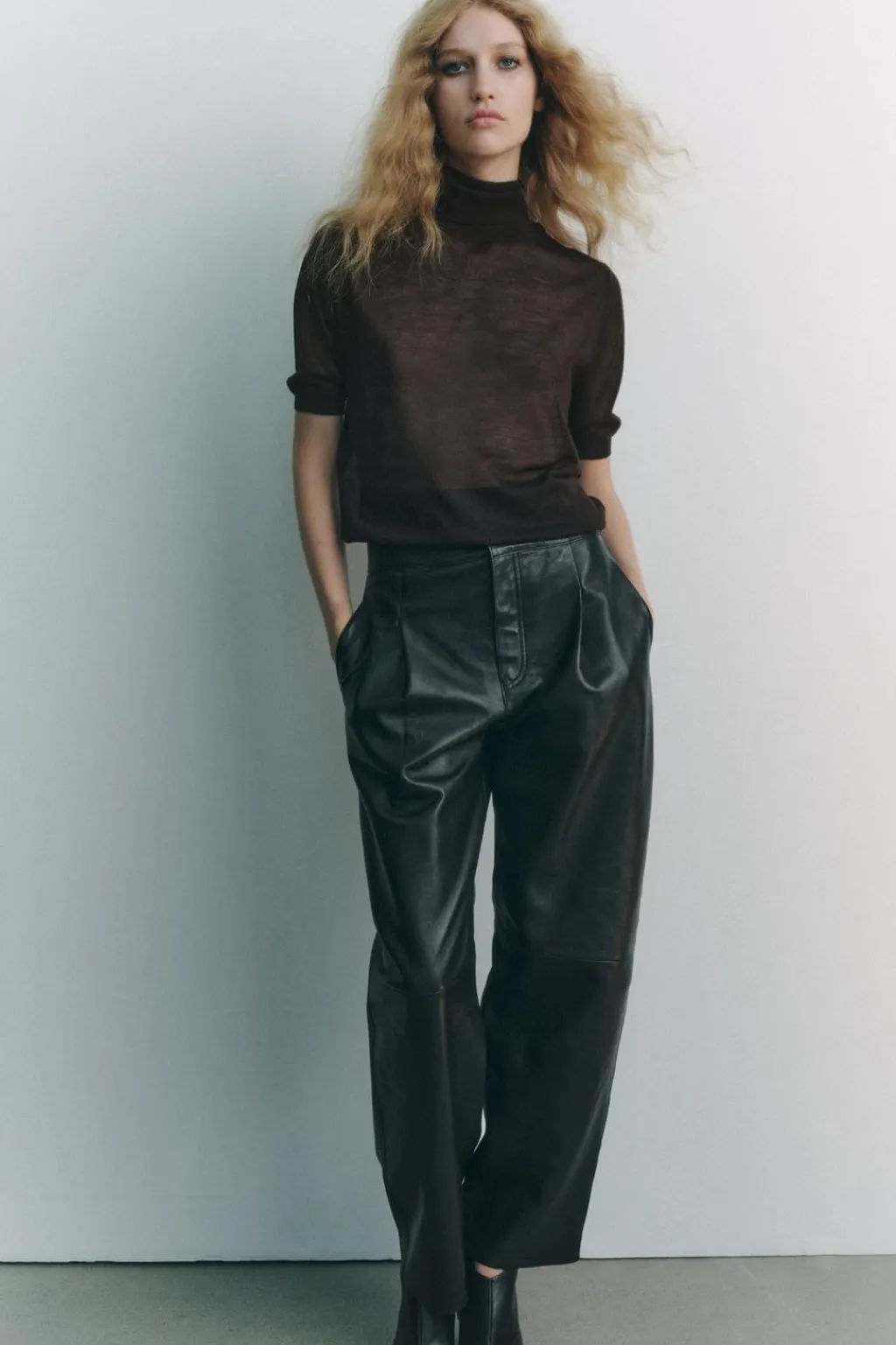 Jersey de punto fino confeccionado con cashmere y seda. Cuello subido y manga corta.