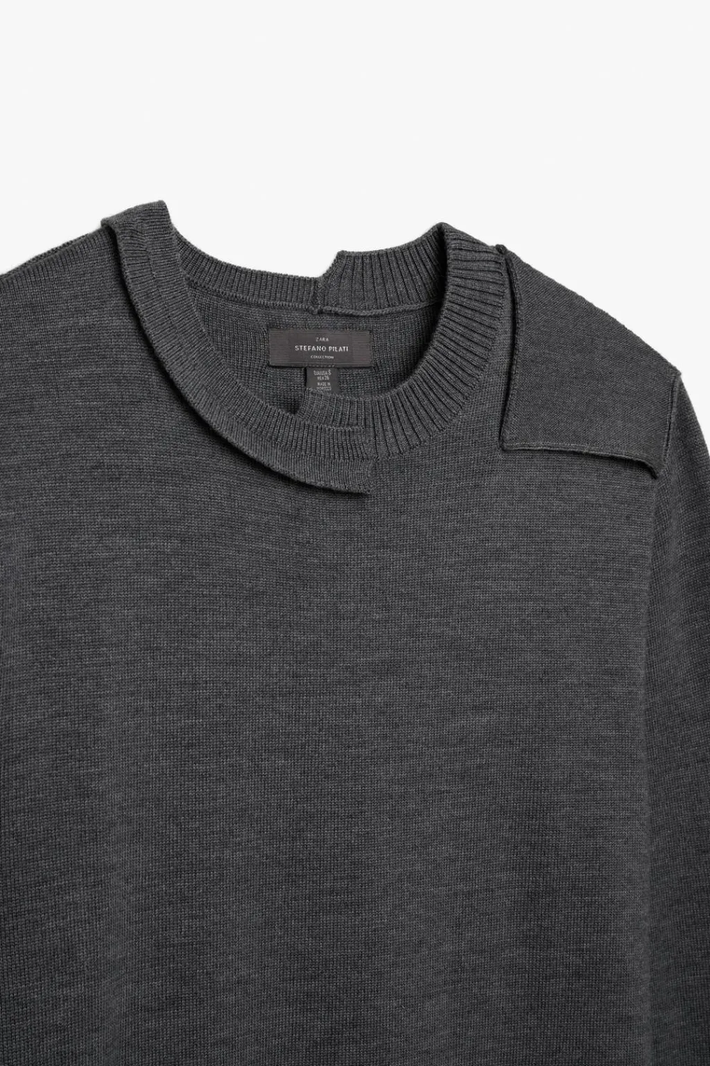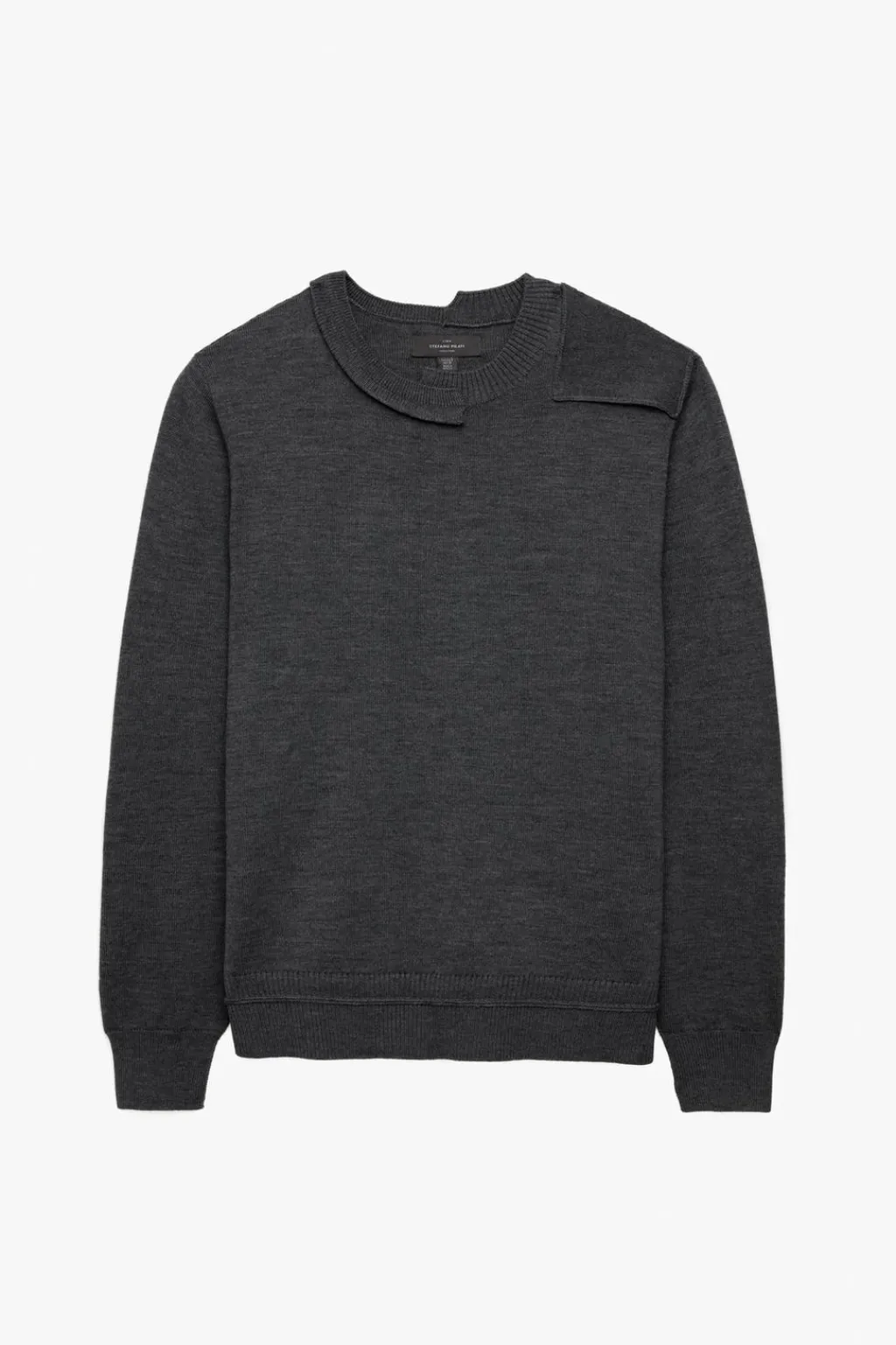 Jersey regular fit de punto tejido en hilatura de lana. Cuello redondo y hombro con aplicación de parches combinados a tono. Manga larga con detalle de cut out asimétrico. Acabados en rib.
