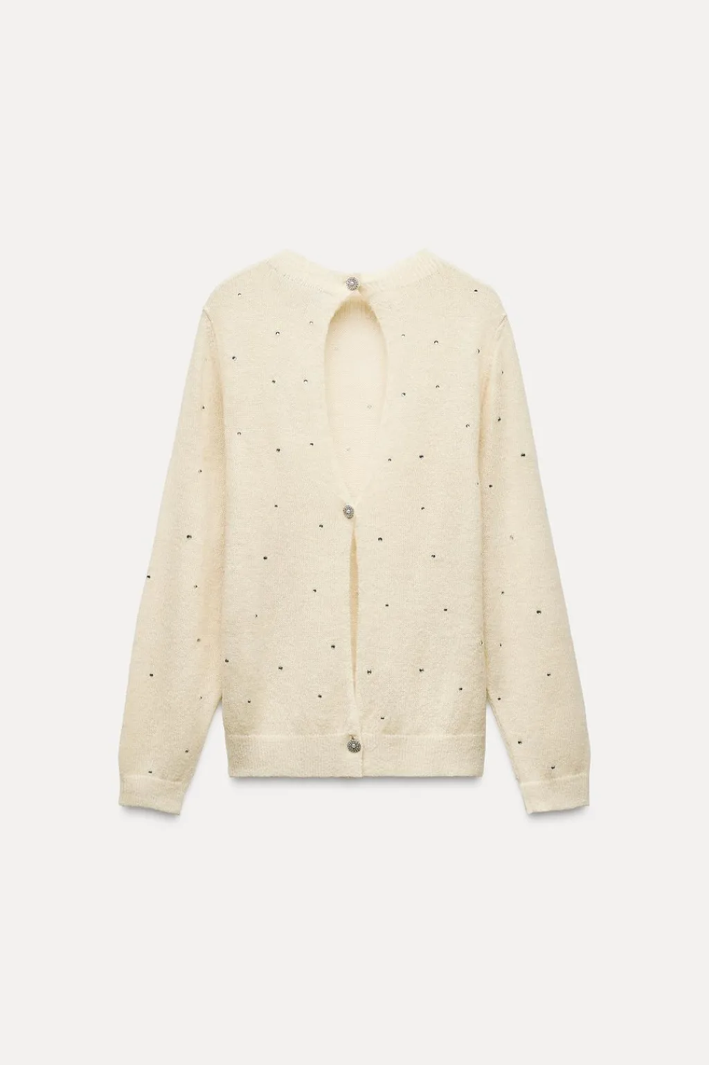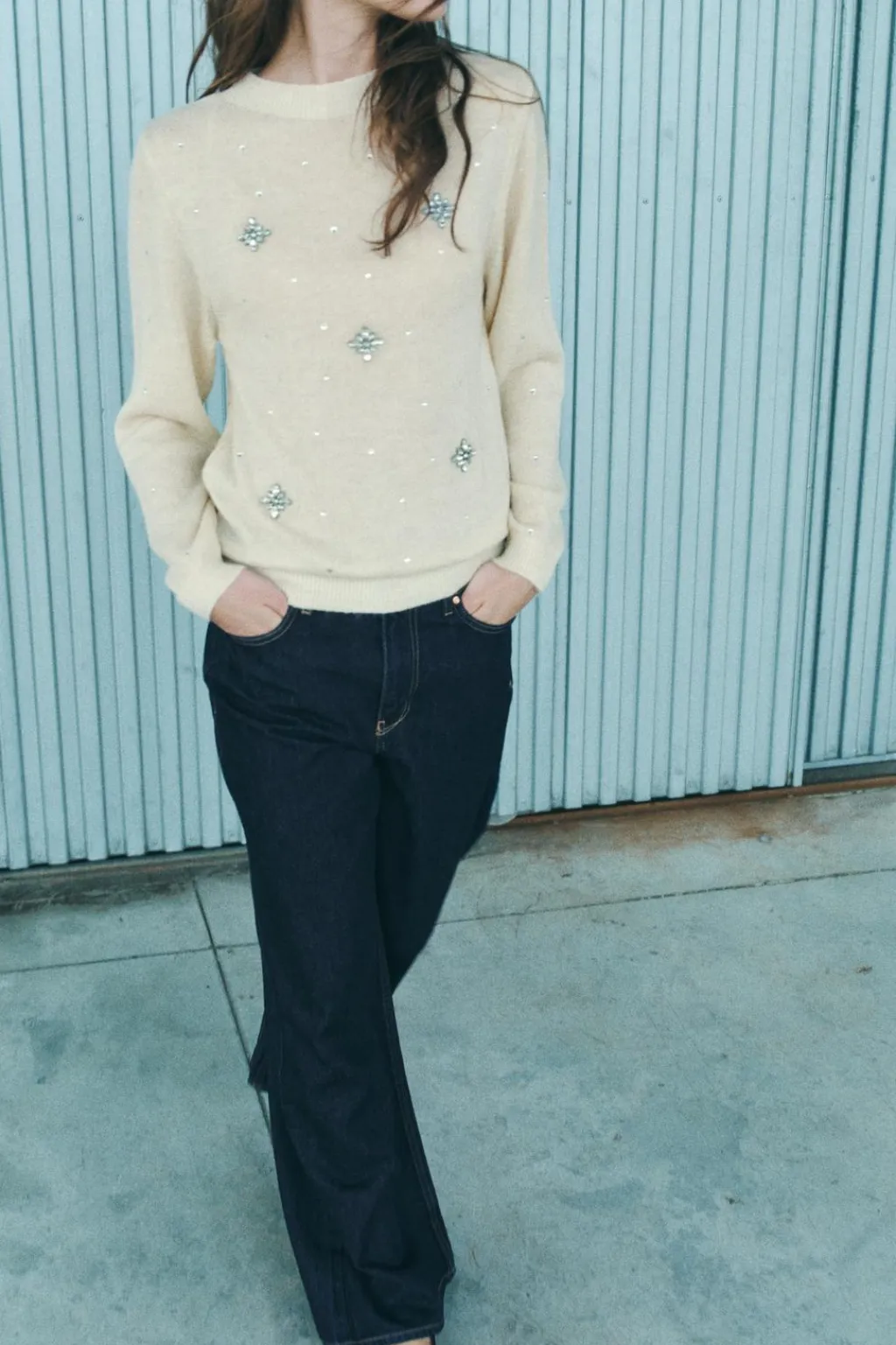 Jersey confeccionado en hilatura con lana 7%. Cuello redondo y manga larga. Detalle de aplicación de joyas y aberturas en espalda. Acabados en rib a tono.