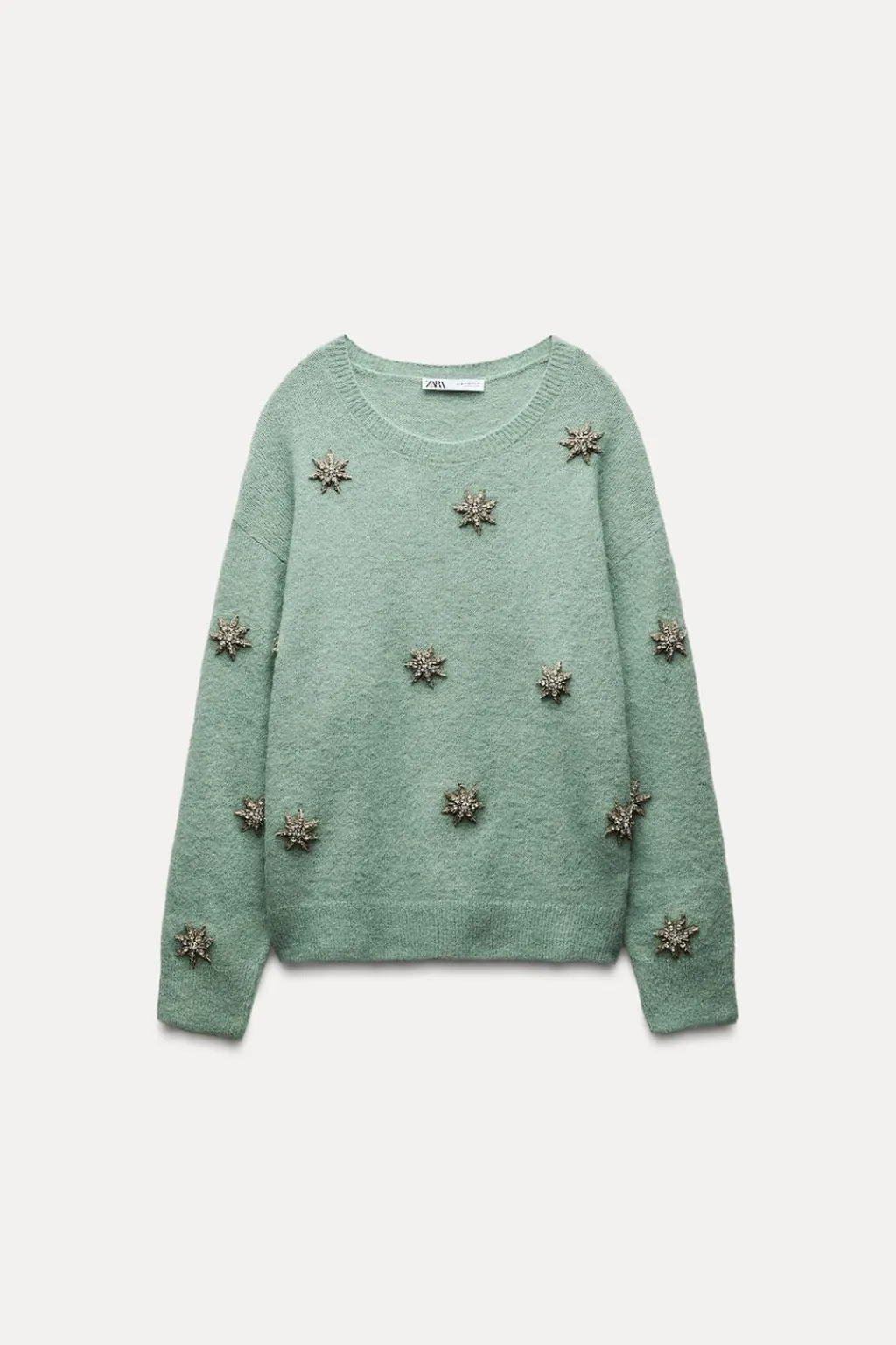 Jersey confeccionado con alpaca. Cuello redondo y manga larga. Detalle de aplicación de abalorios joya. Acabados en rib.
