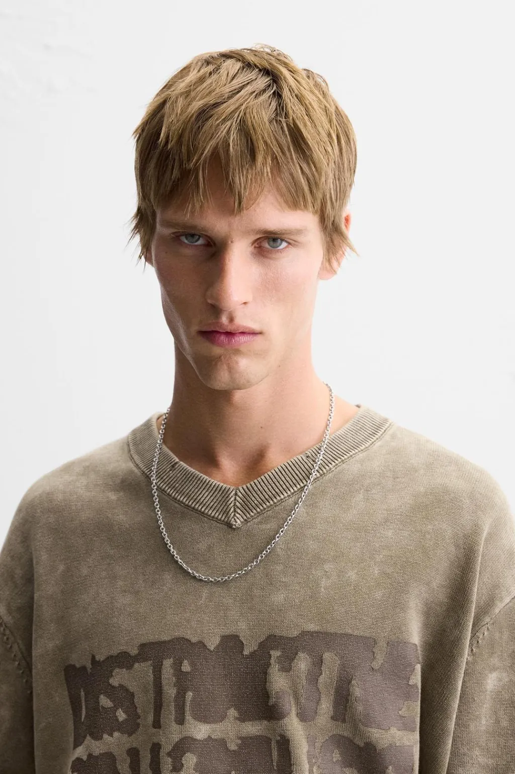 Jersey relaxed fit tejido en hilatura de algodón. Cuello pico y manga larga. Texto estampado combinado a contraste en delantero. Efecto lavado. Acabados en rib.