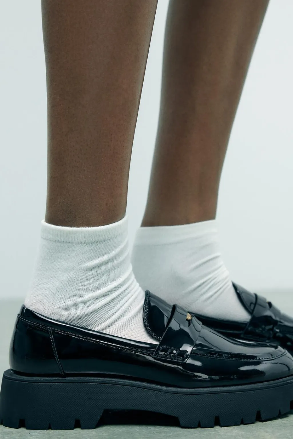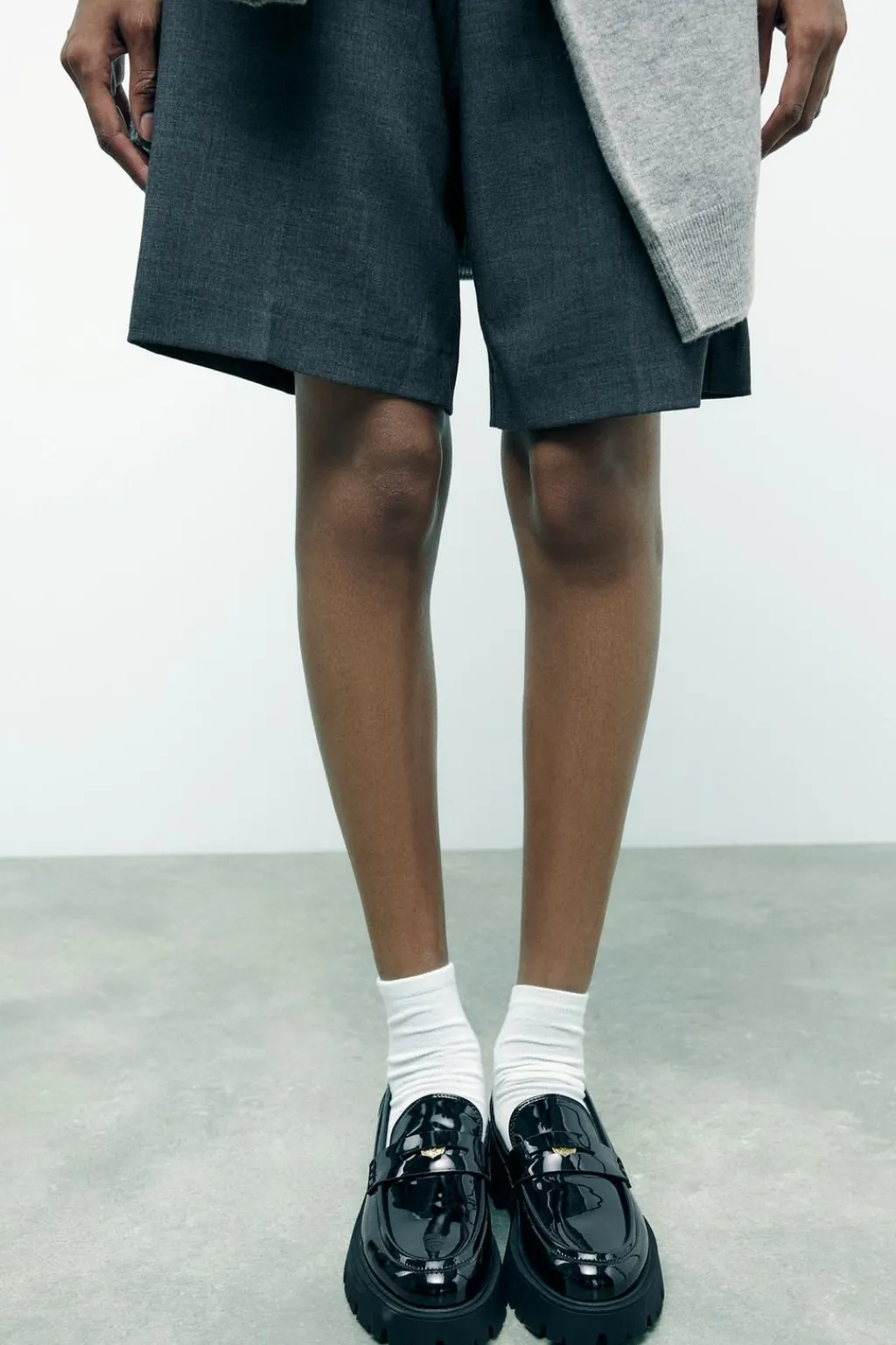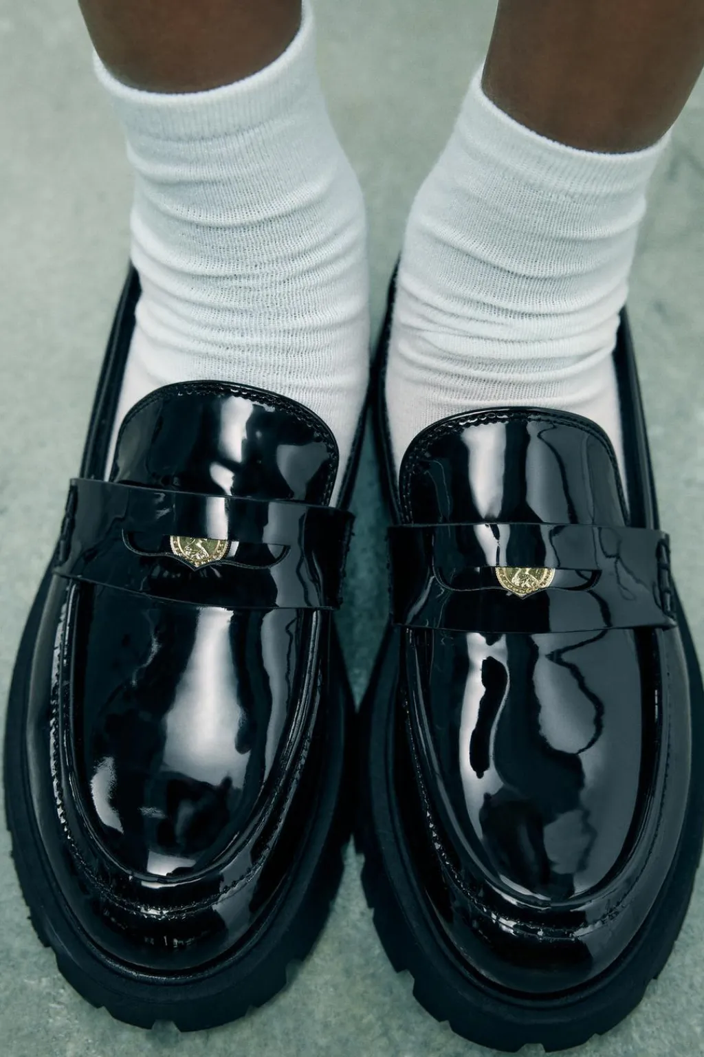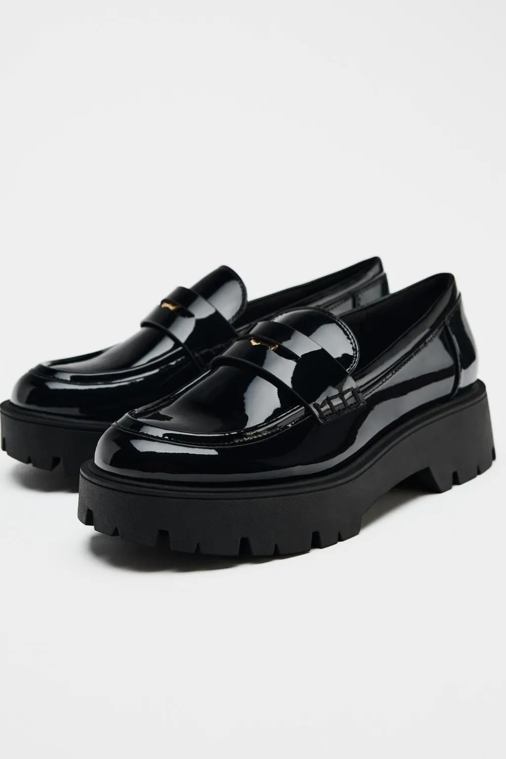 Zapato tipo mocasín con suela track. Efecto acharolado. Detalle de placa y antifaz en la parte delantera.