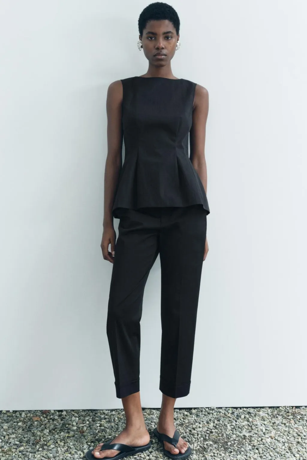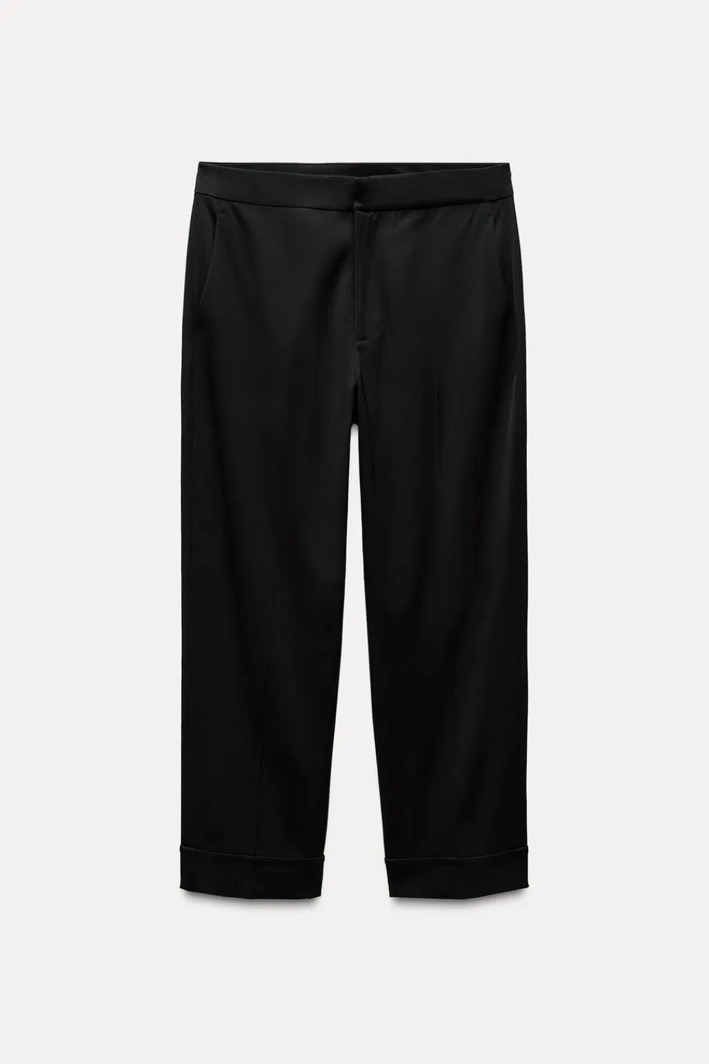 Pantalón tipo capri de tiro alto. Bolsillos laterales y falsos bolsillos de vivo en espalda. Bajo acabado con vuelta. Cierre frontal con cremallera, botón interior y ganchos metálicos.