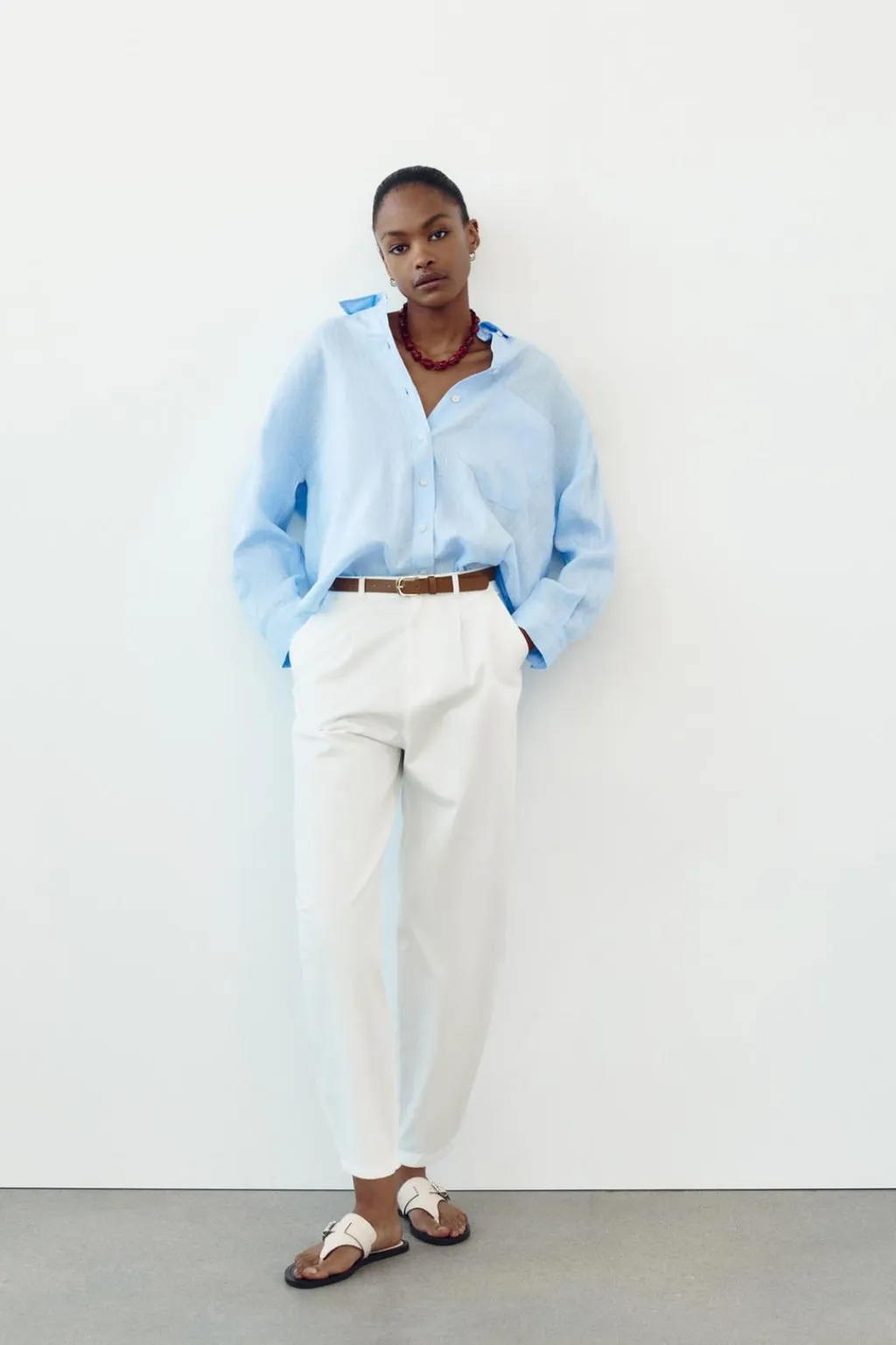 Pantalón tobillero de tiro alto con pinzas delanteras y cinturón. Bolsillos frontales y bolsillos de plastrón en espalda. Cierre delantero con cremallera y botón.