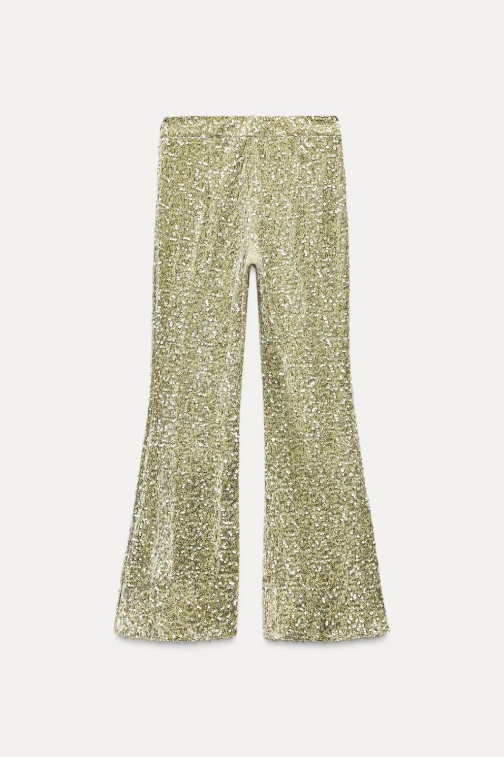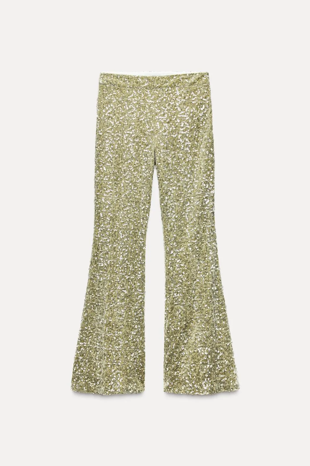Pantalón de tiro alto con lentejuelas. Bajo acabado en evasé. Cierre lateral con cremallera oculta en costura.