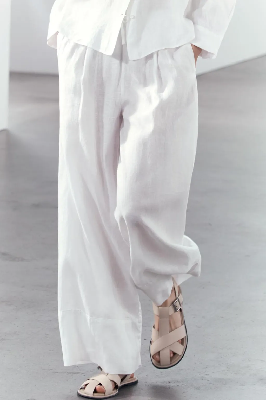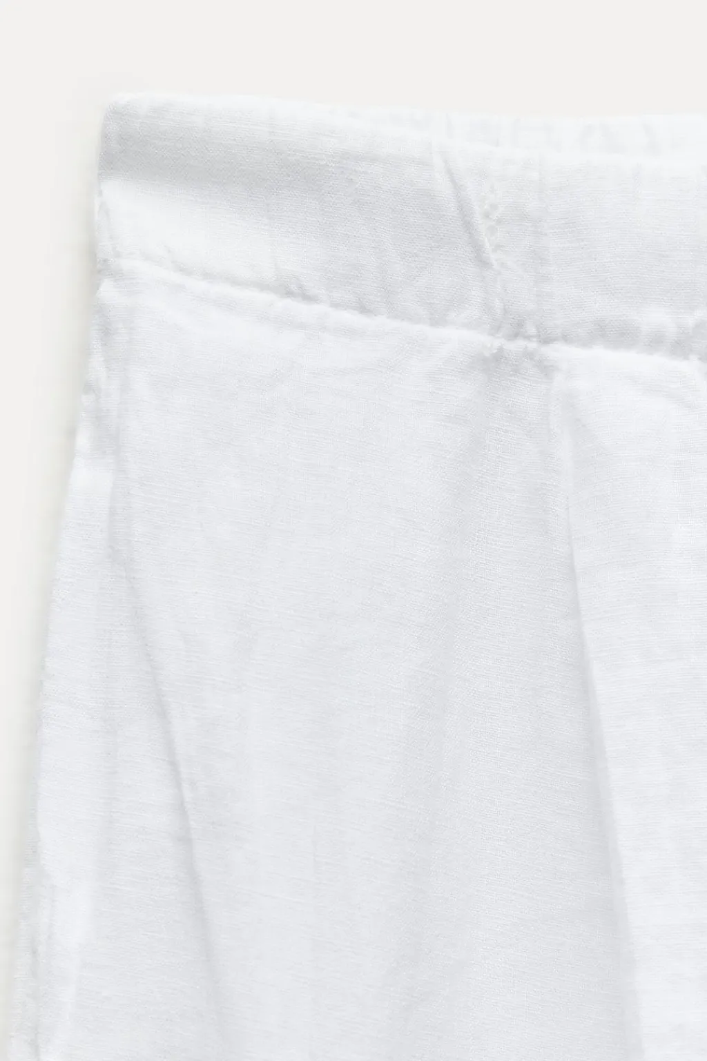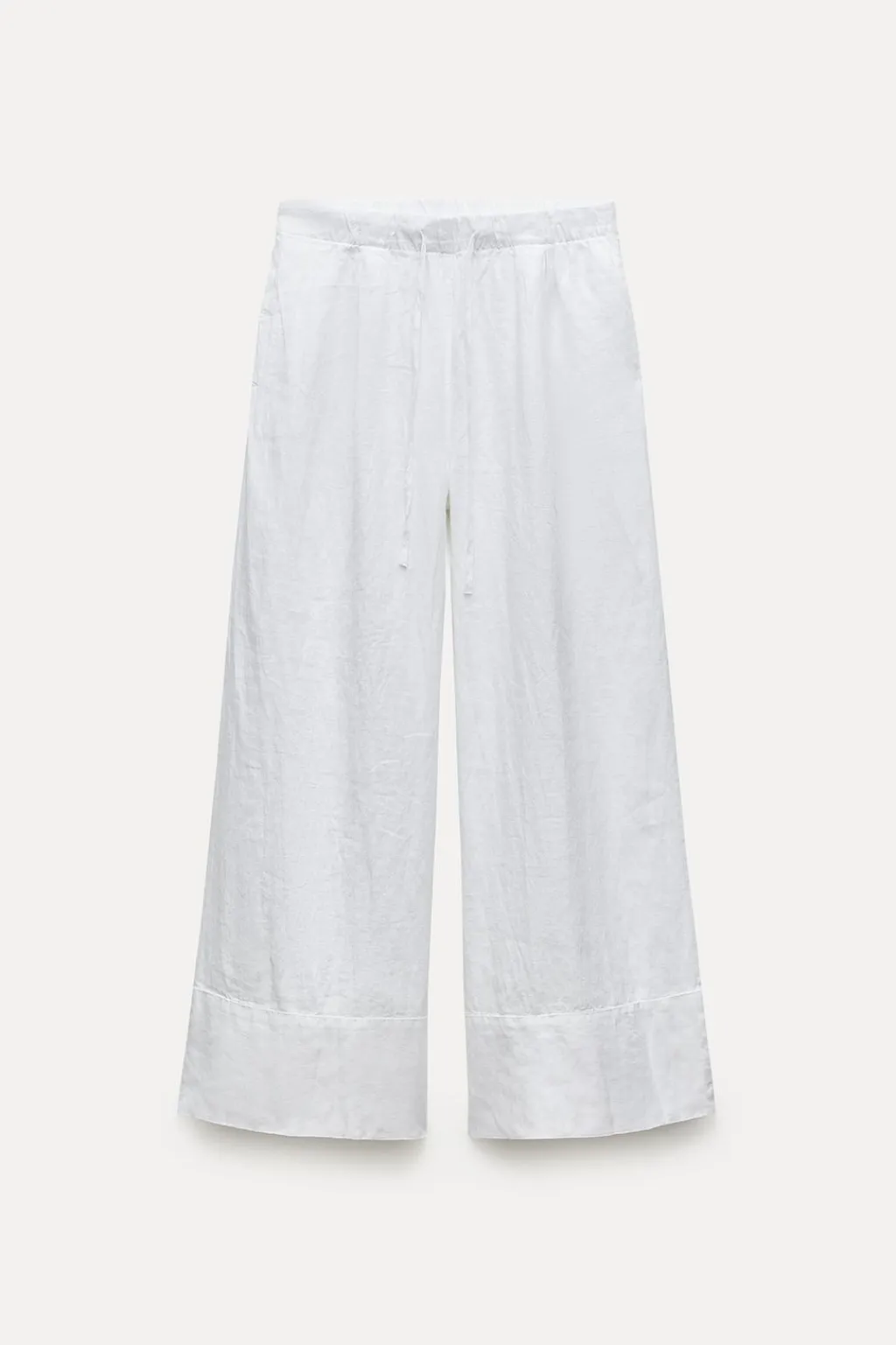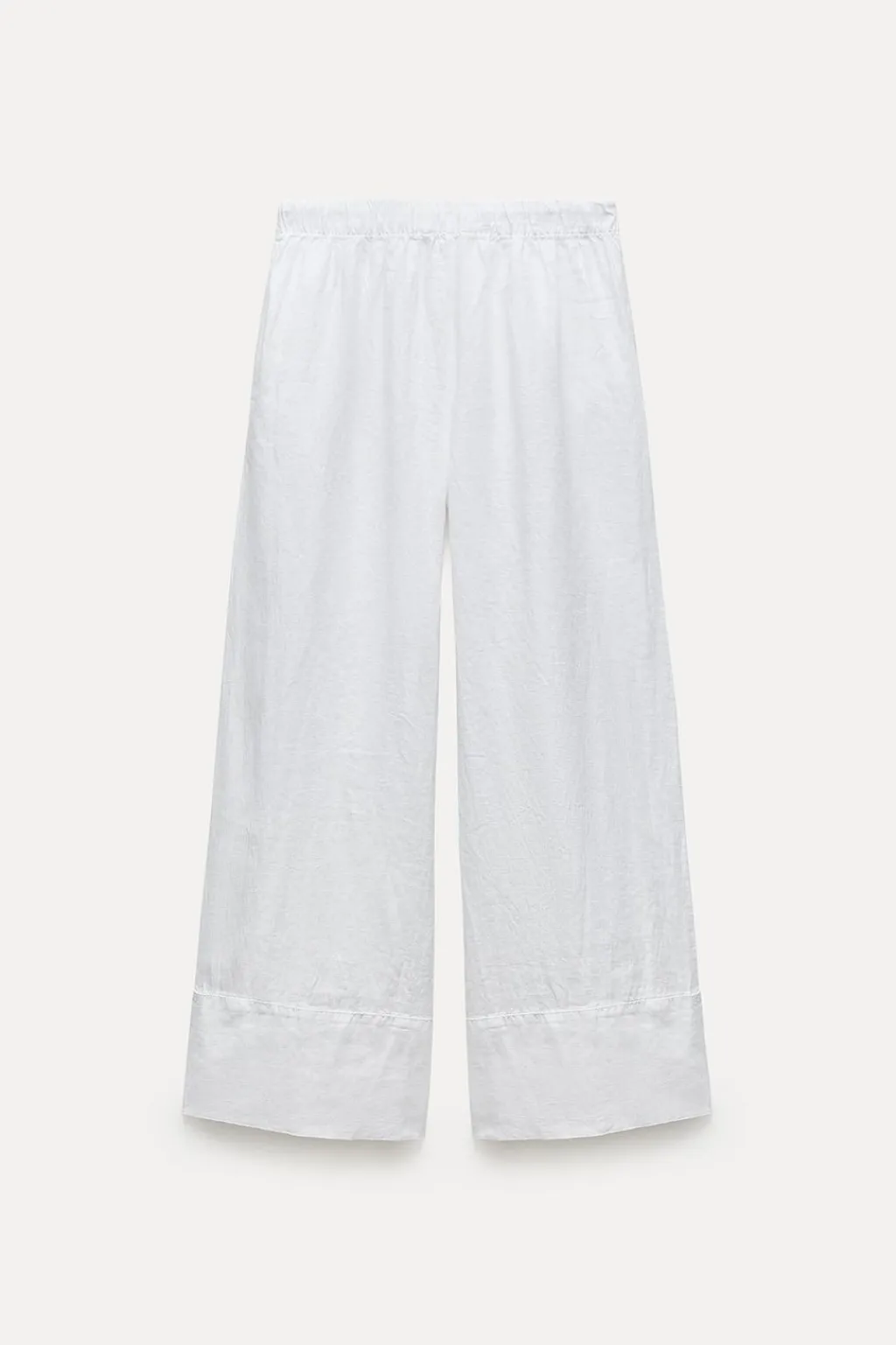 Pantalón confeccionado en hilatura de lino 100%. Tiro medio y cintura con elástico ajustable con cordones. Bolsillos laterales ocultos en costura. Pierna ancha.