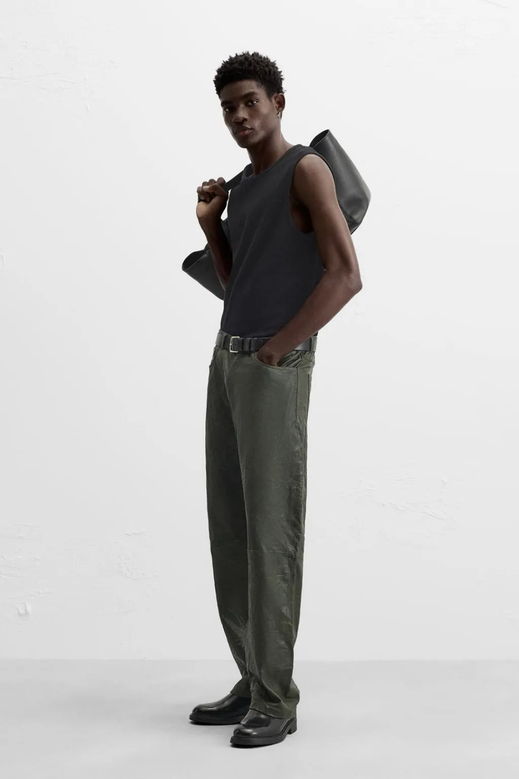 Pantalón relaxed fit confeccionado en piel con efecto arrugado. Cinco bolsillos. Cierre frontal con cremallera y botón.