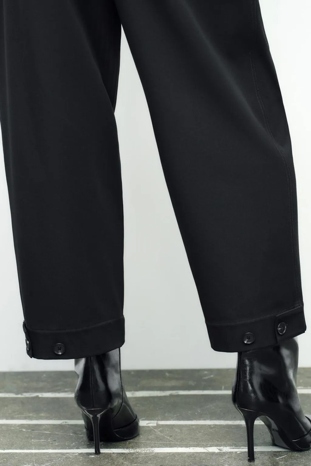 Pantalón de tiro alto con pinzas delanteras. Bolsillos frontales y falso bolsillo de vivo en espalda. Pernera ancha y bajo ajustable con botones. Cierre frontal con cremallera y botón.