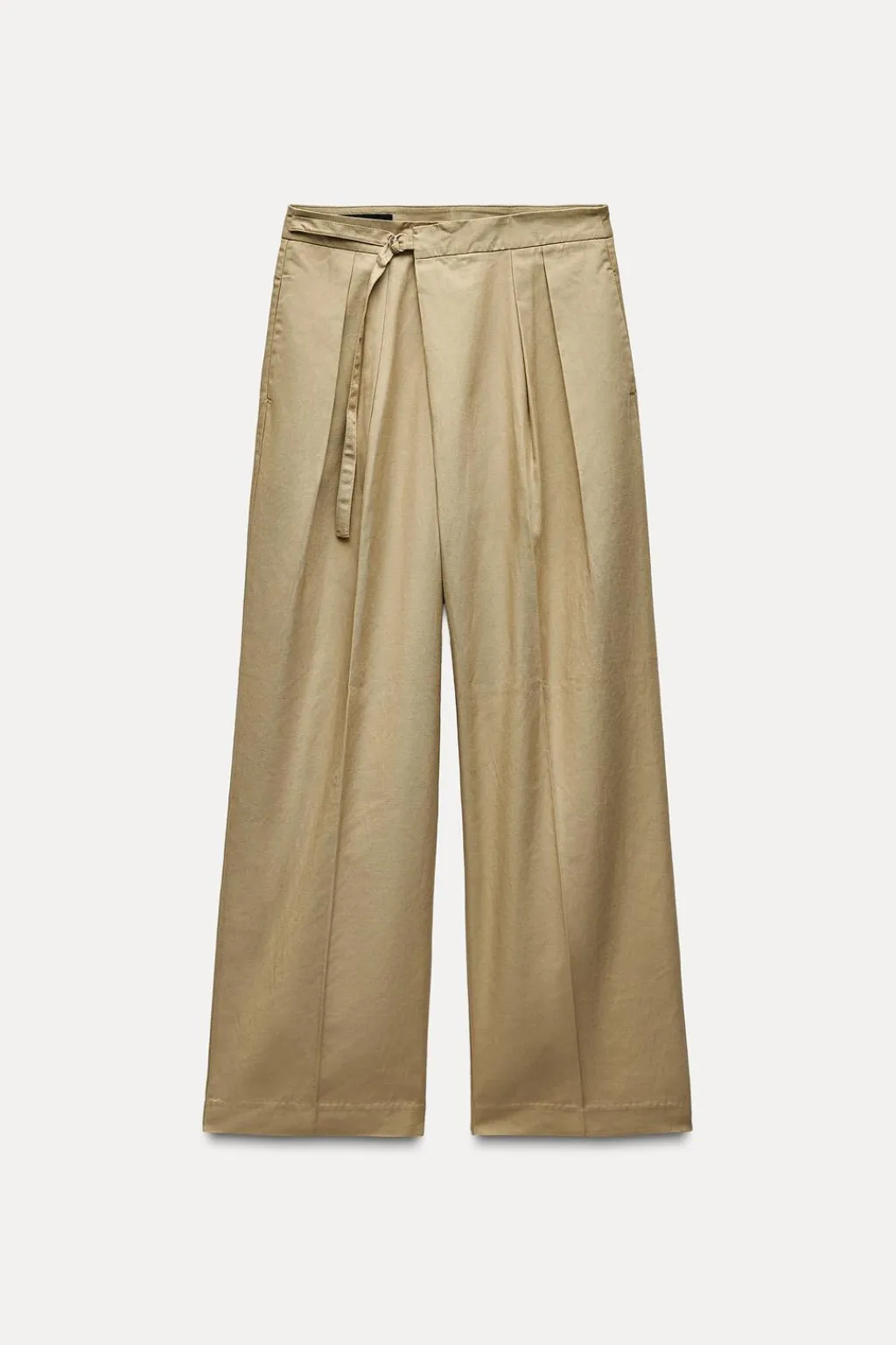 Pantalón de tiro alto con bolsillos en delantero y falsos bolsillos de vivo en espalda. Detalle de pinzas en delantero. Cierre frontal con cremallera, gancho metálico y tira en mismo tejido con hebilla metálica.