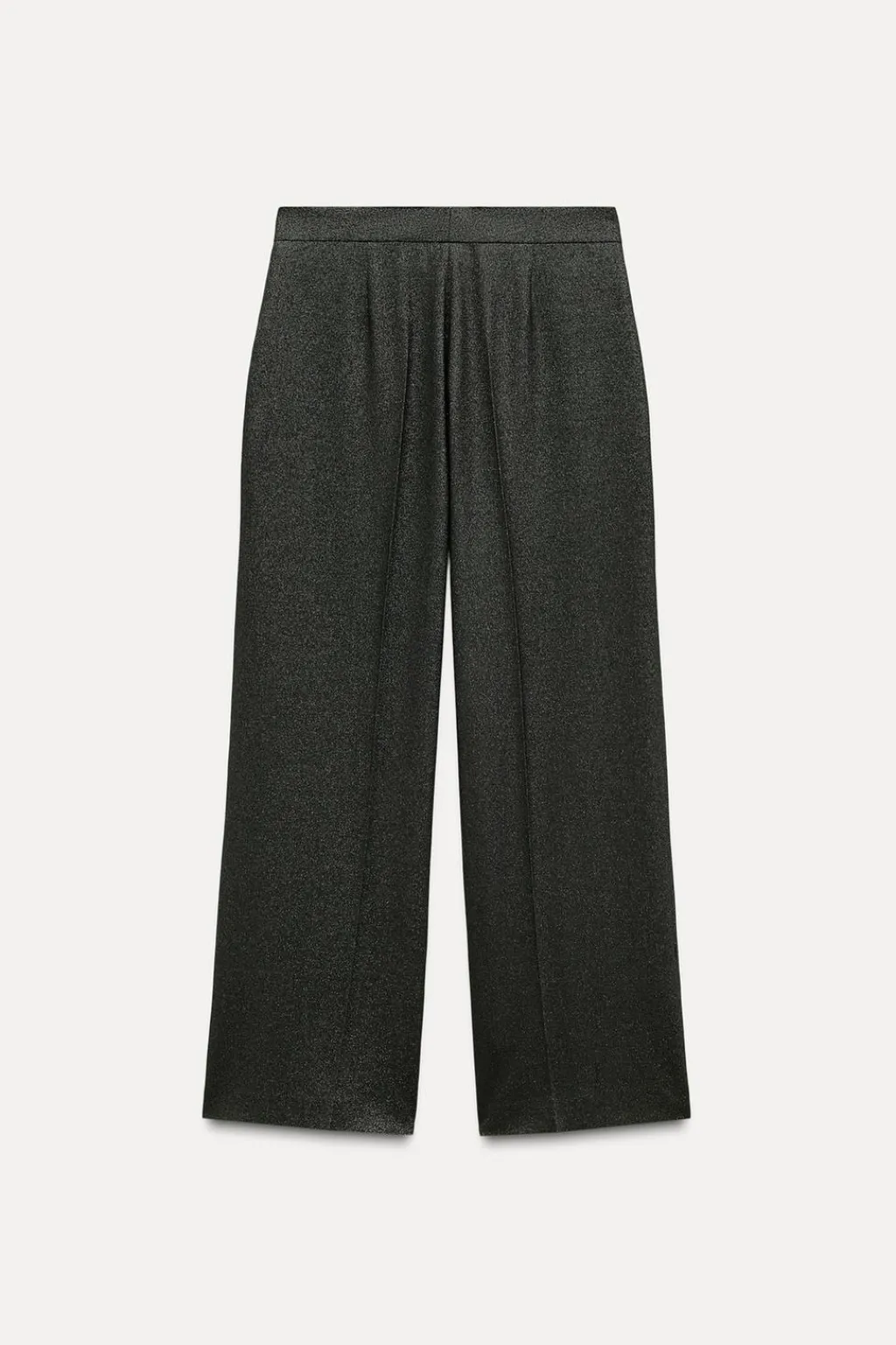 Pantalón de tiro alto con tejido efecto brillo. Bolsillos delanteros. Pernera recta. Cierre frontal con cremallera, botón interior y gancho.