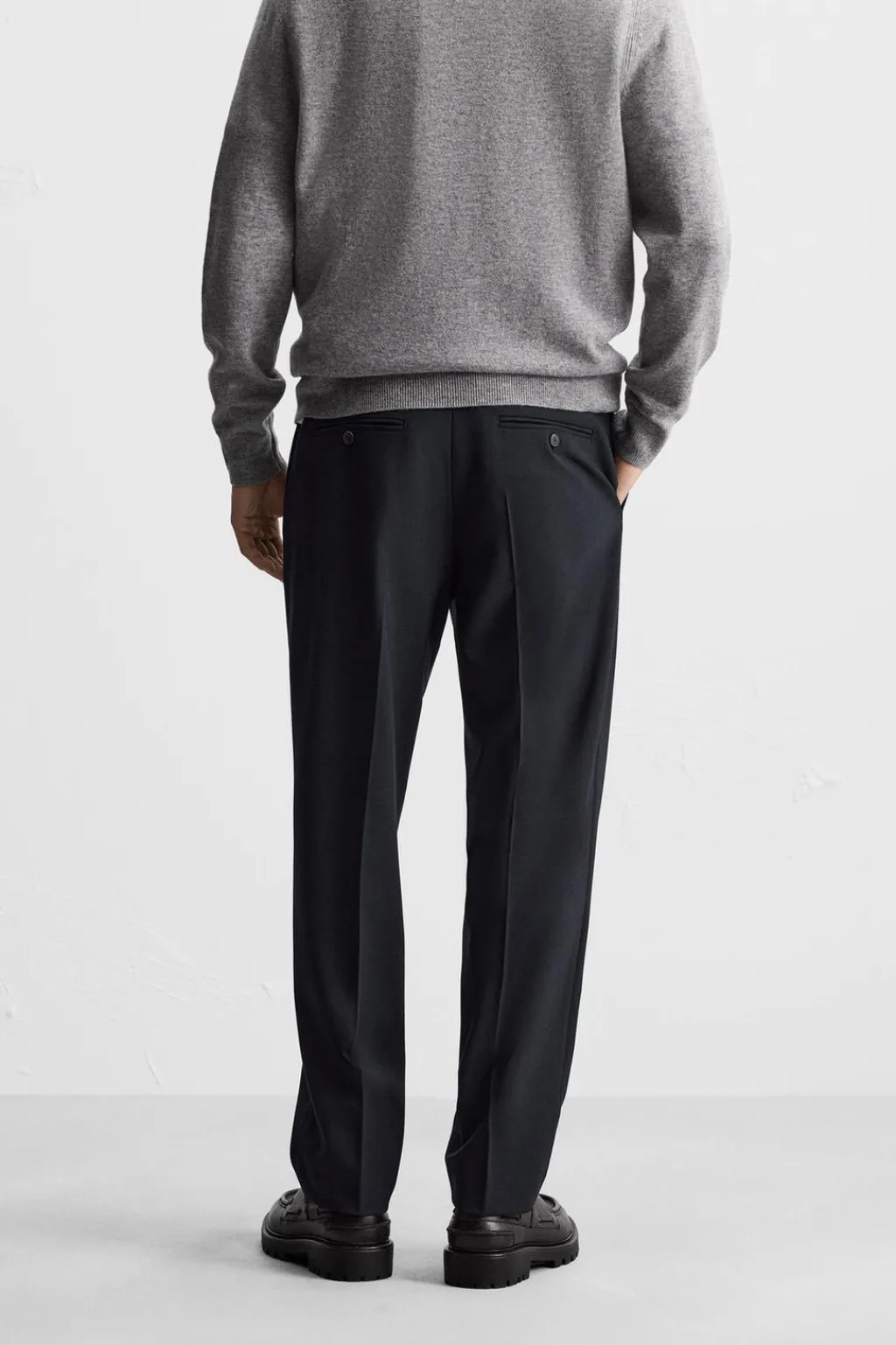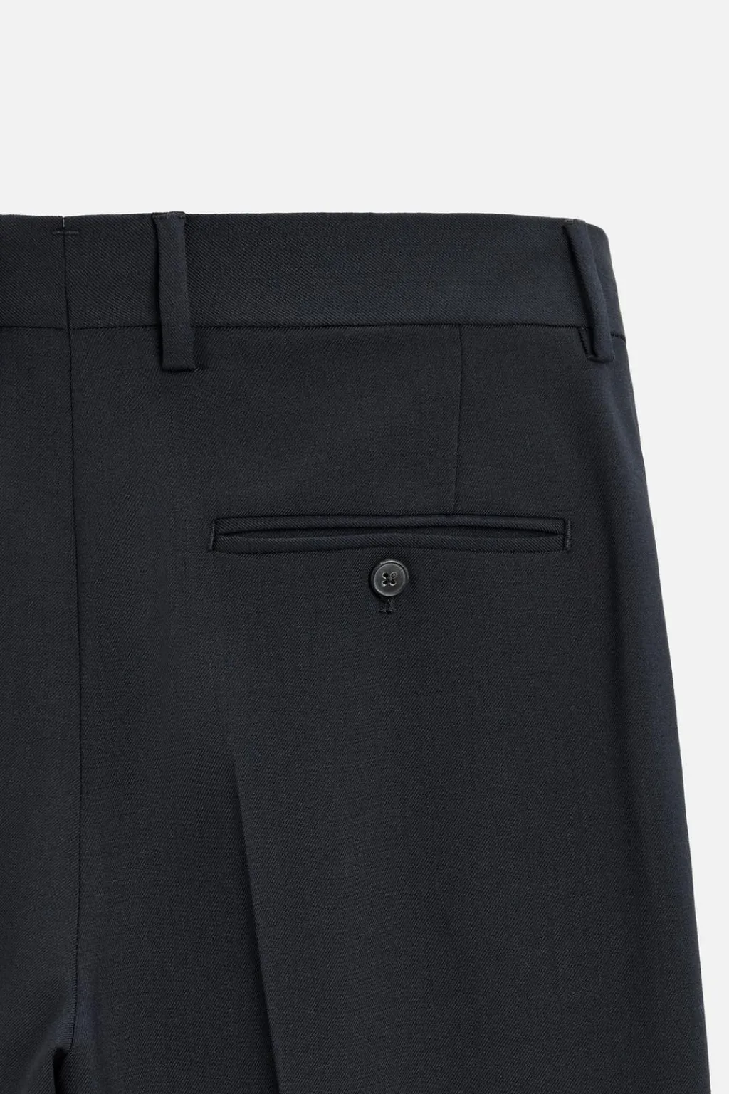 Pantalón slim fit confeccionado en tejido con lana. Bolsillos frontales y detalle de bolsillos traseros de doble vivo con botón. Cierre frontal con cremallera y botón.