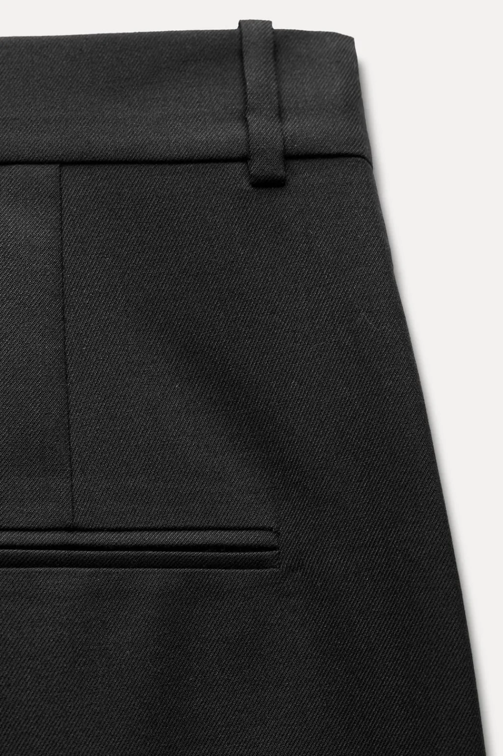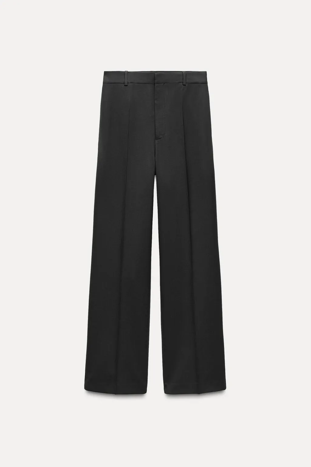 Pantalón de tiro alto confeccionado en hilatura con lana 28%. Cintura con trabillas. Bolsillos laterales ocultos en costura. Detalle de raya planchada. Cierre frontal con cremallera, botón y ganchos metálicos.