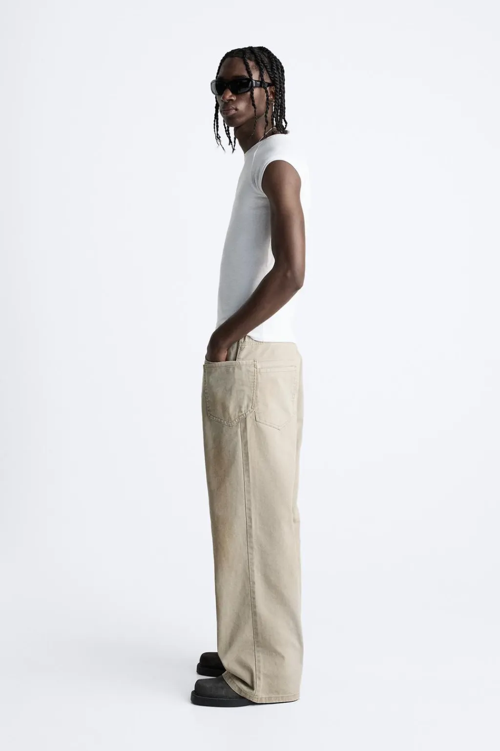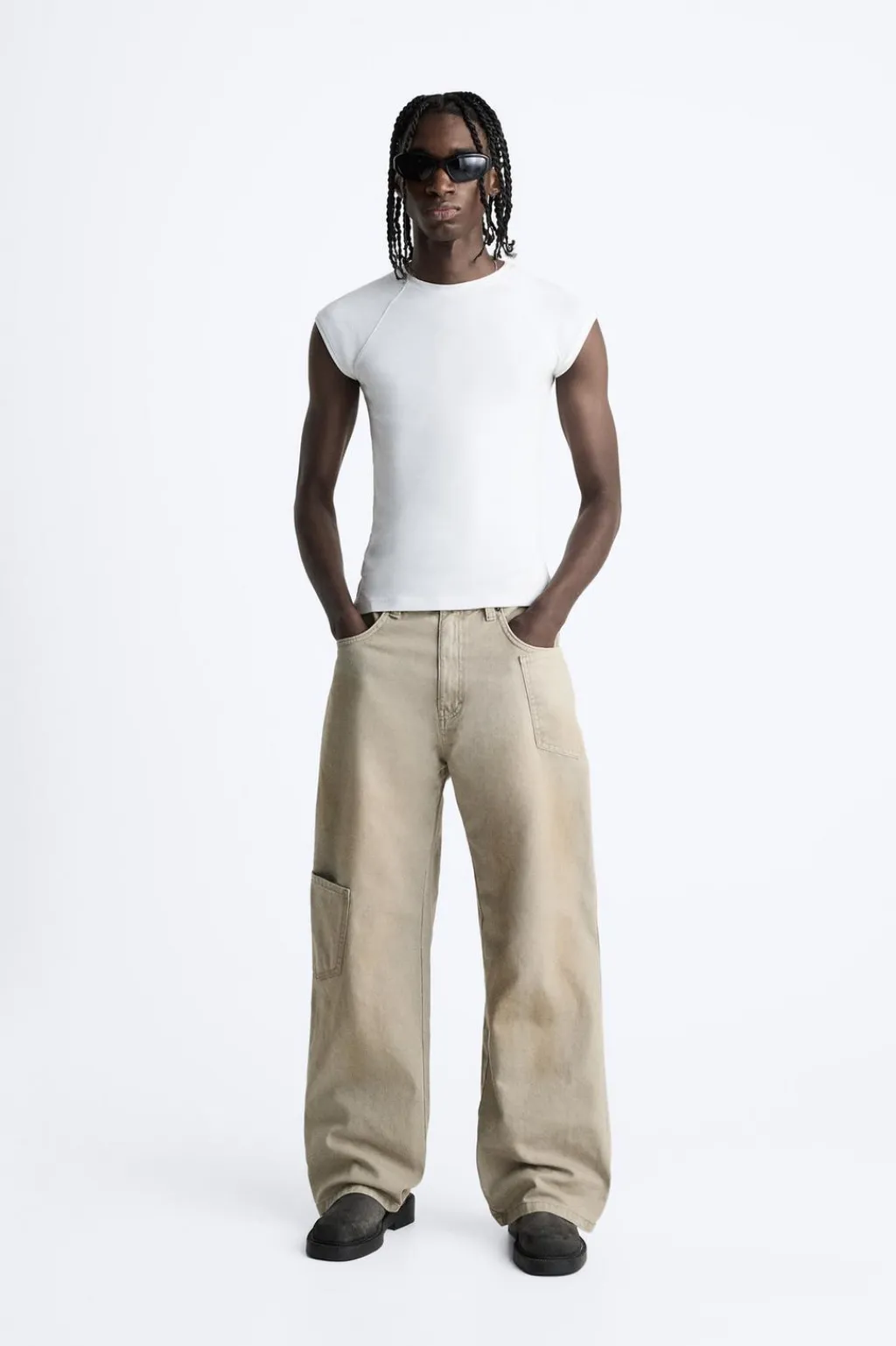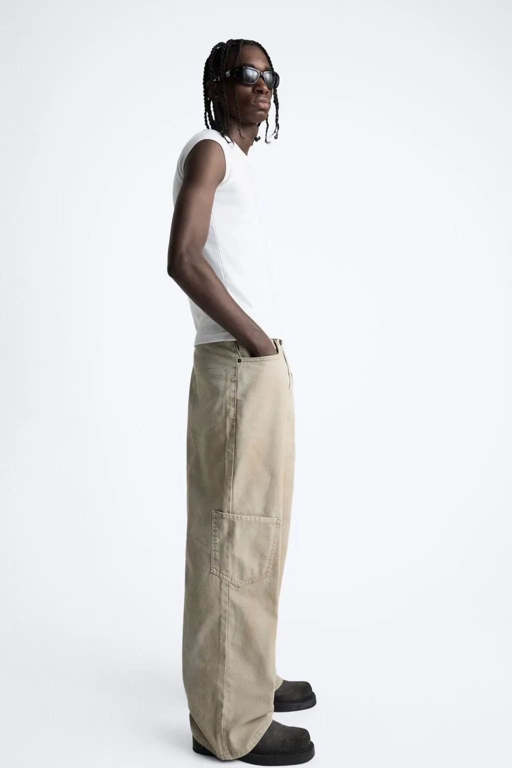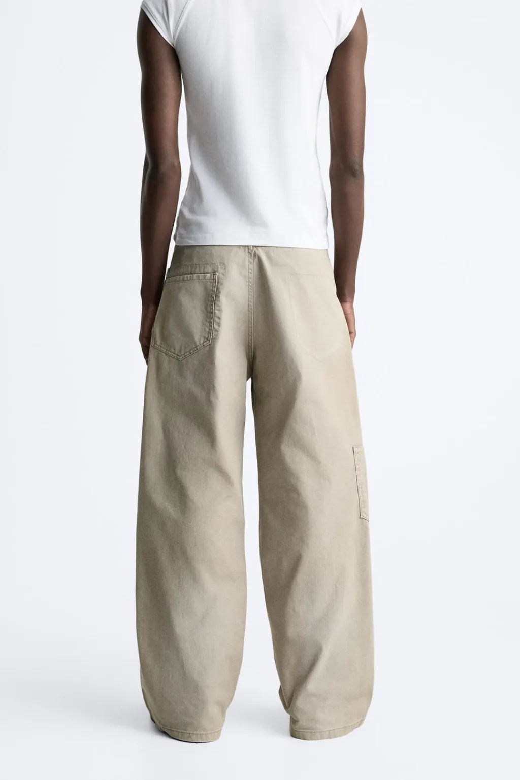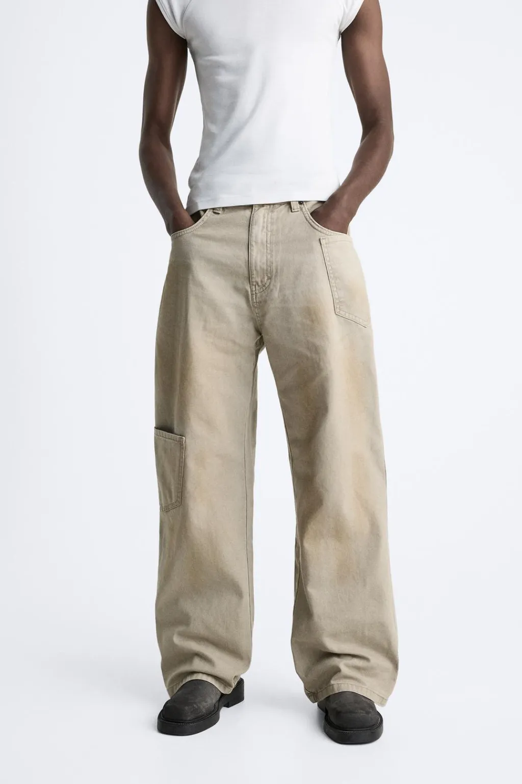 Pantalón wide fit. Cinco bolsillos. Aplicación de bolsillo plastrón en pernera. Efecto lavado. Cierre frontal con cremallera y botón.