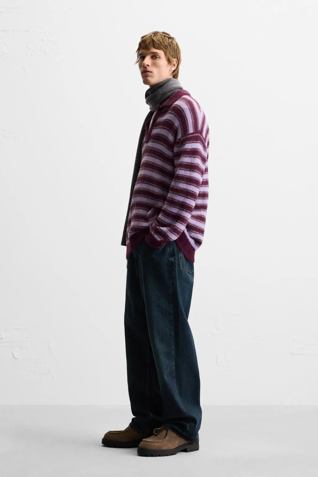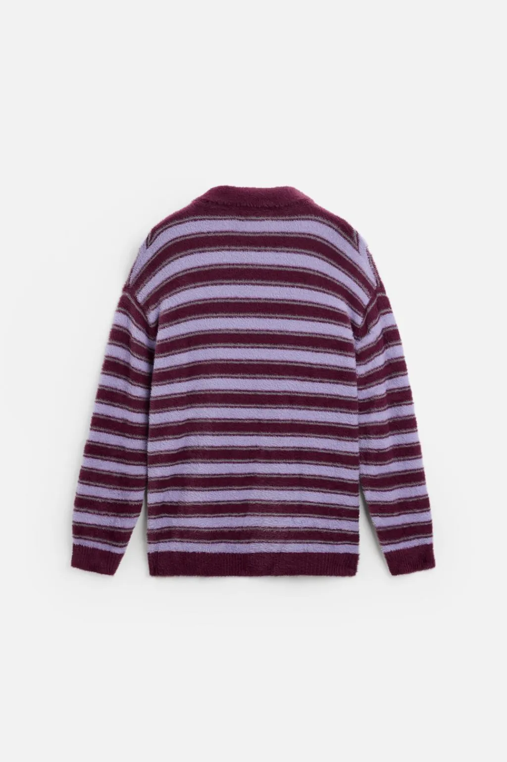 Polo relaxed fit tejido en hilatura con efecto pelo. Cuello solapa con cierre frontal de botonadura. Manga larga. Acabados en rib.