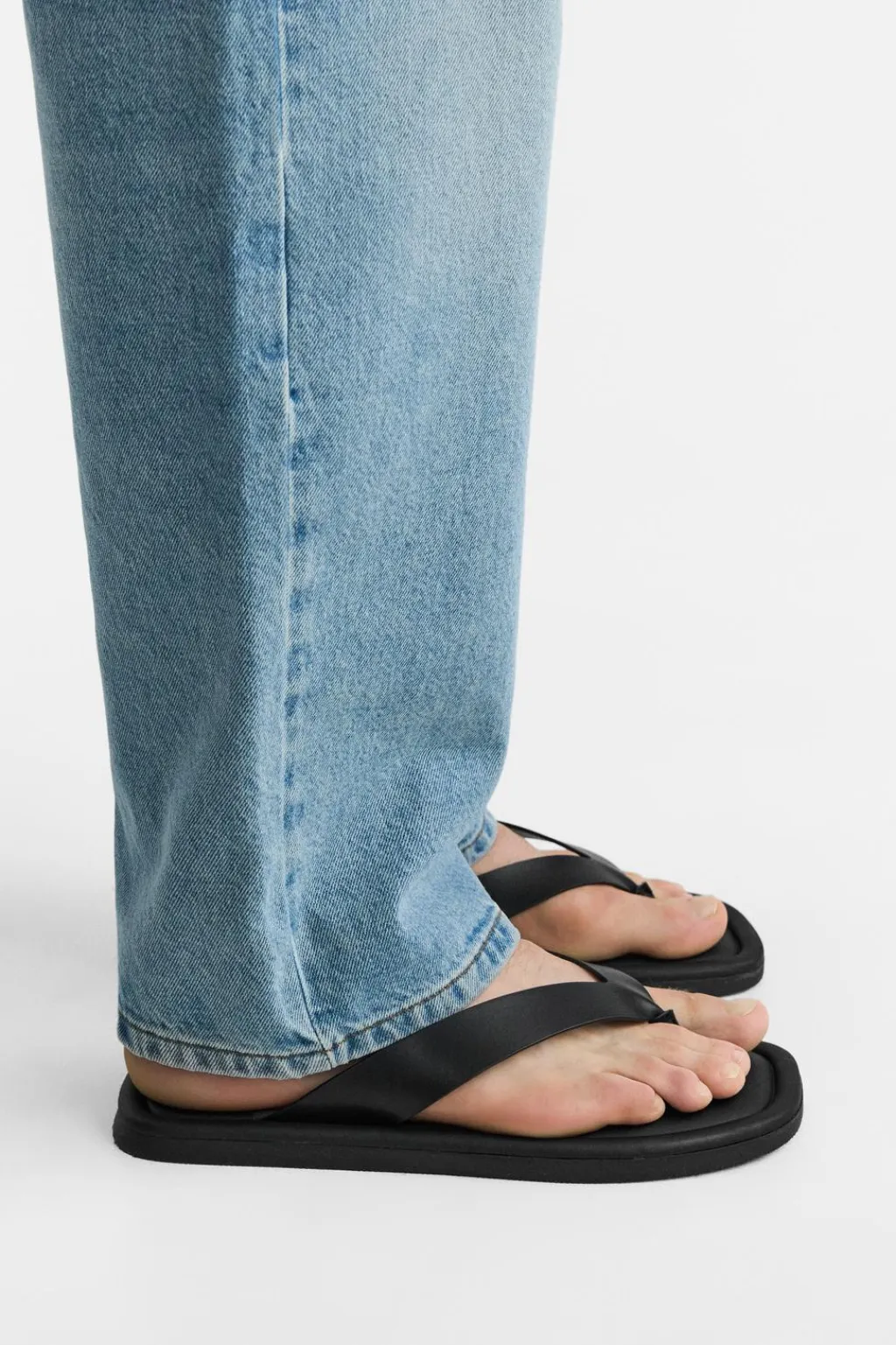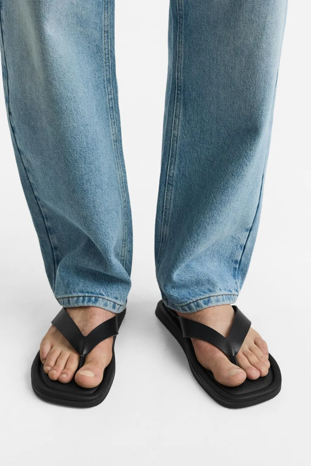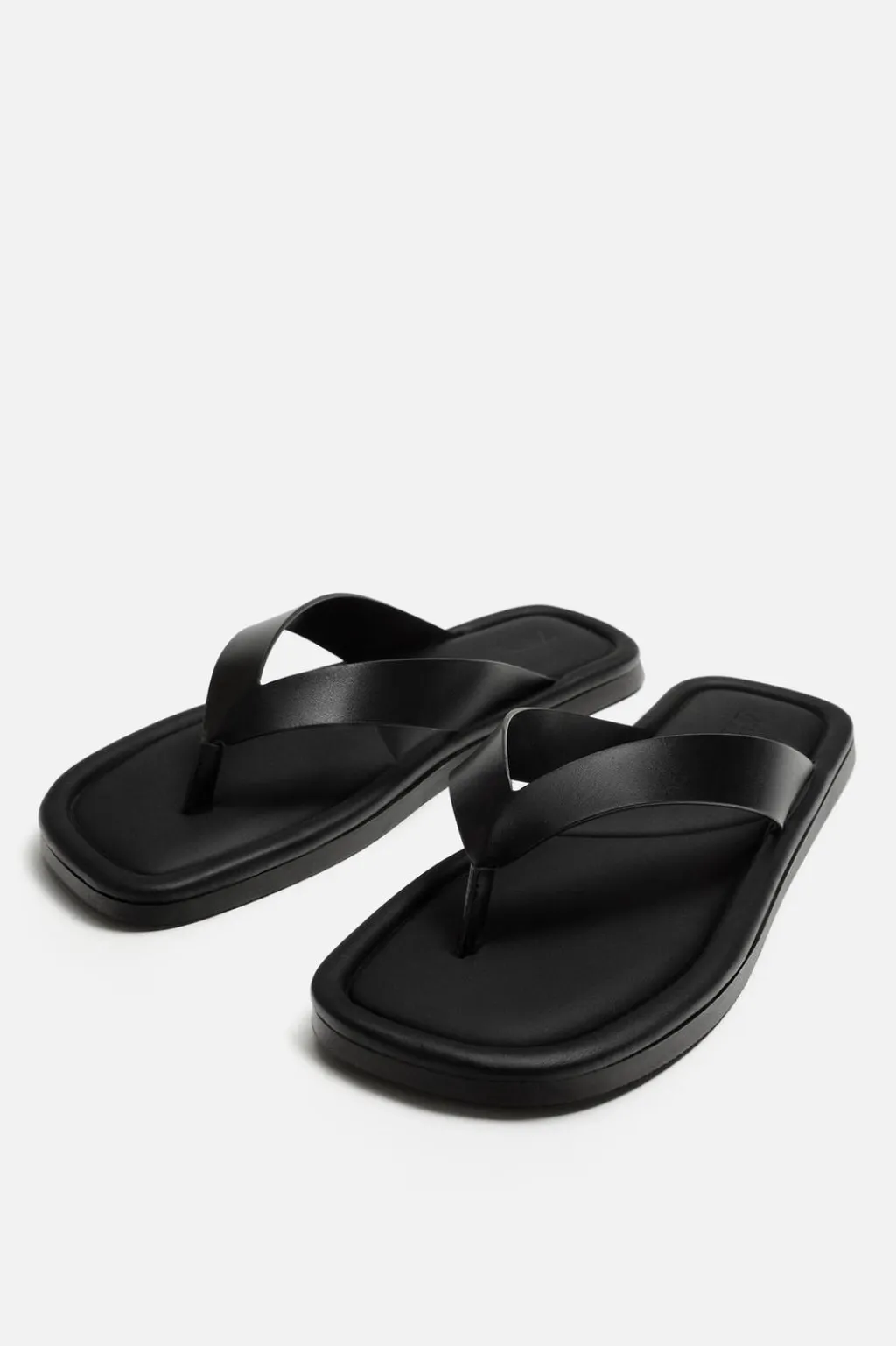 Sandalia fabricada con tiras de piel. Ajuste envolvente en el empeine. Suela en mismo tono de color que el corte.
