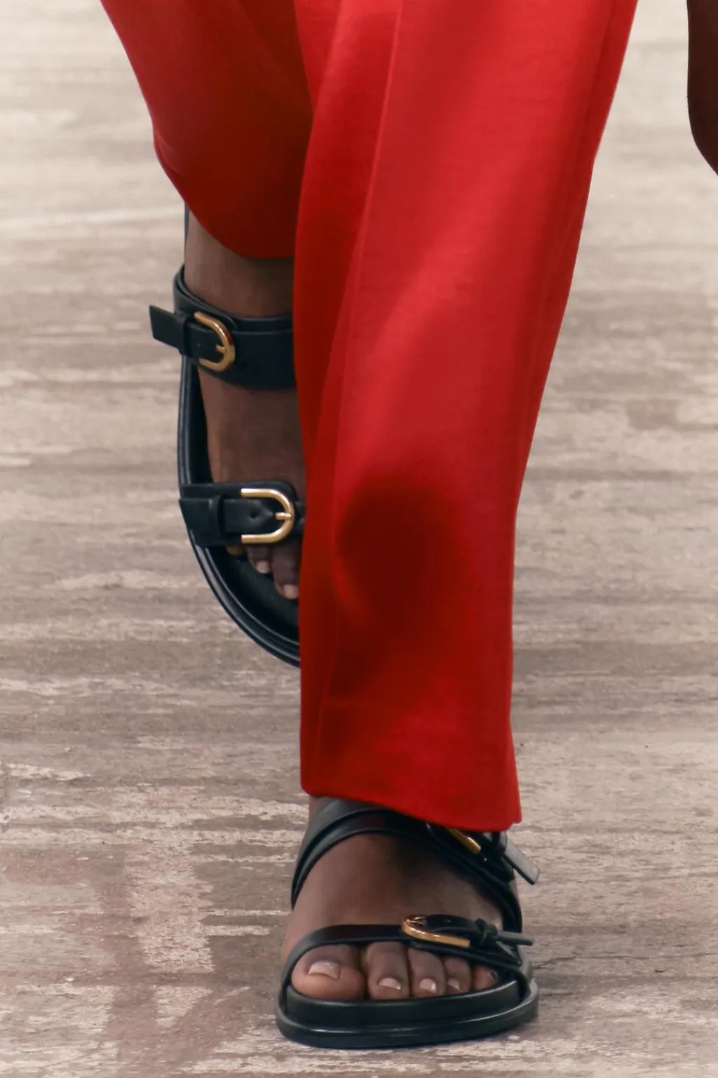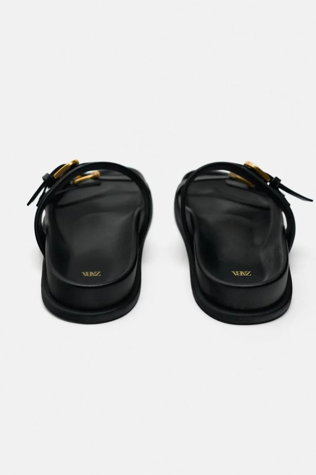 Sandalia plana con tiras y hebillas. Acabado en punta redonda.