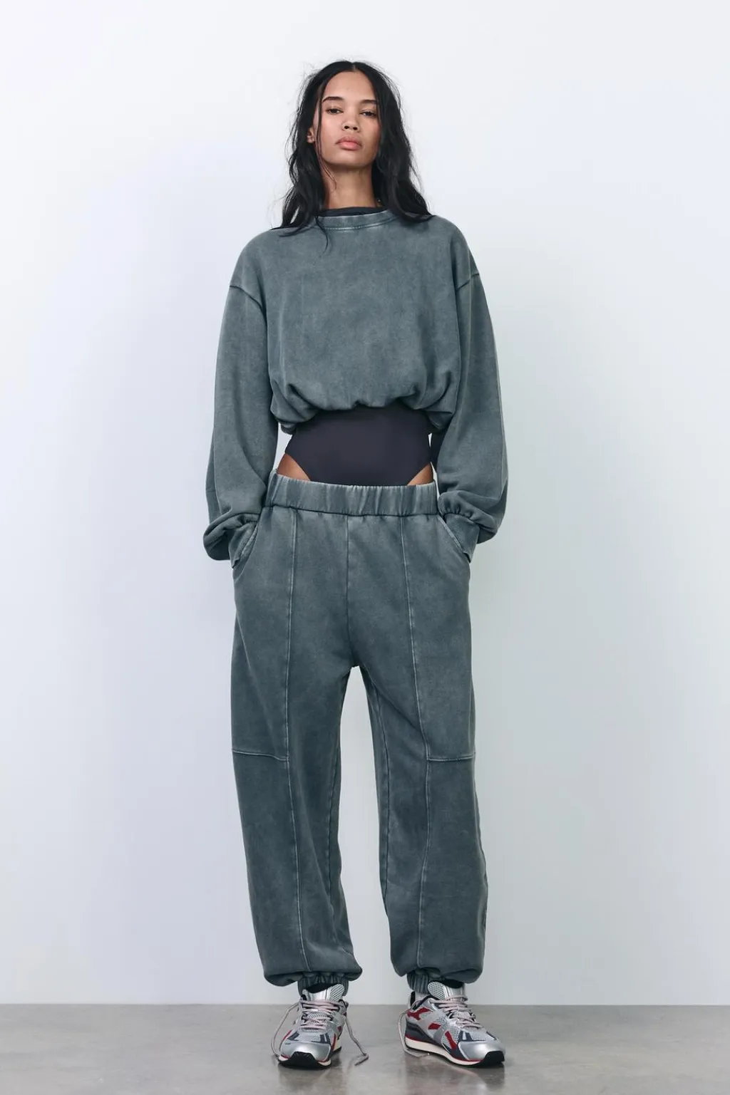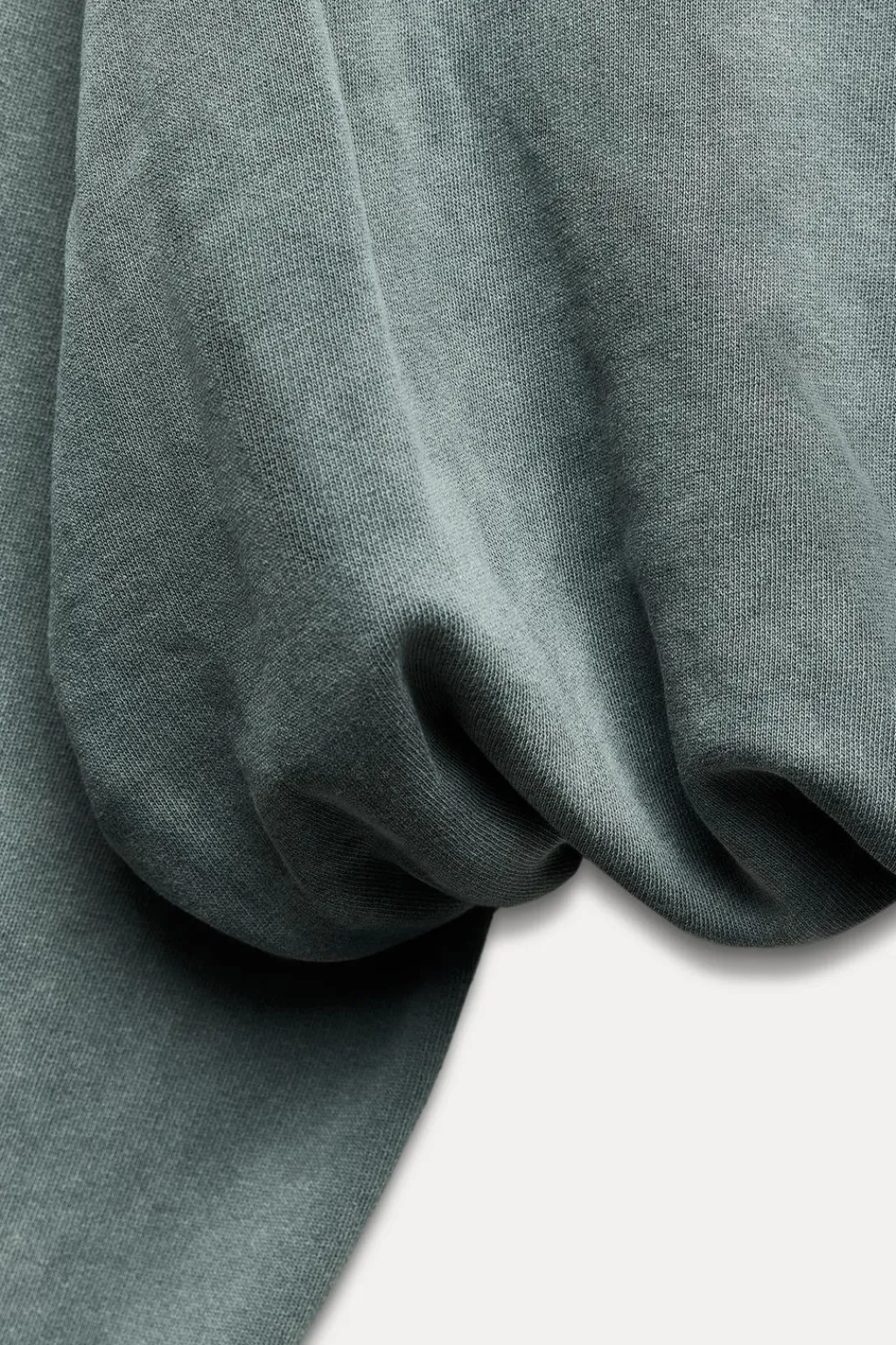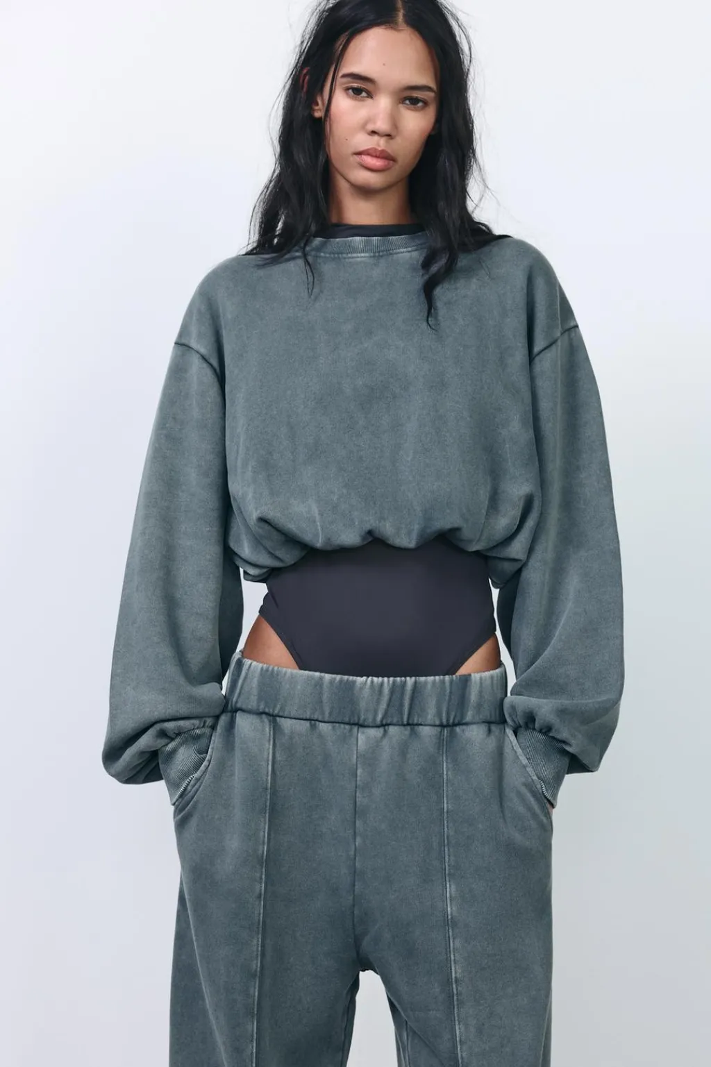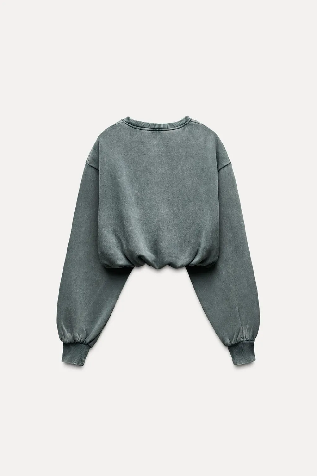 Sudadera confeccionada en algodón efecto lavado. Cuello redondo y manga larga acabados en rib. Bajo abullonado con elástico interior.