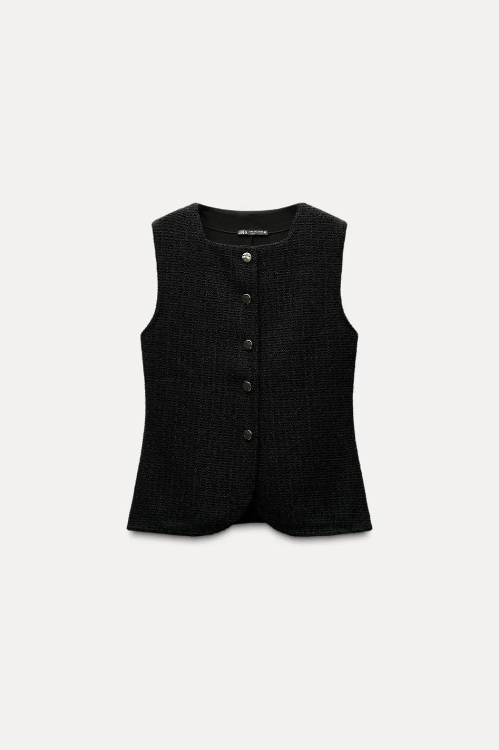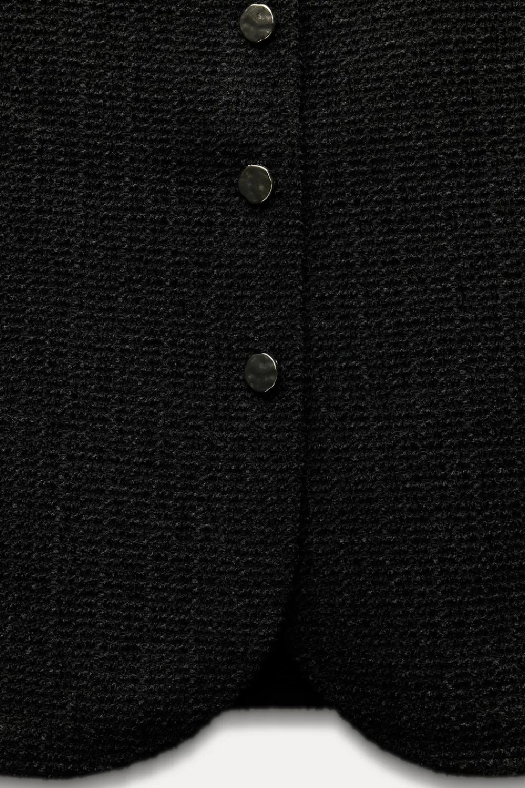 Top tipo chaleco con cuello redondo y manga sisa. Detalle de tejido con estructura. Cierre frontal con botones metálicos.