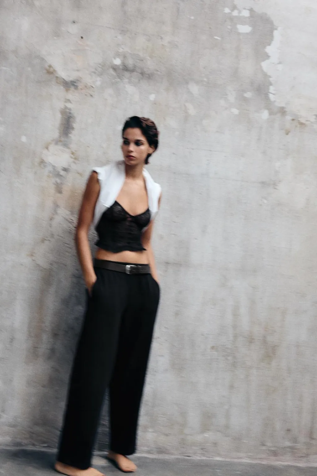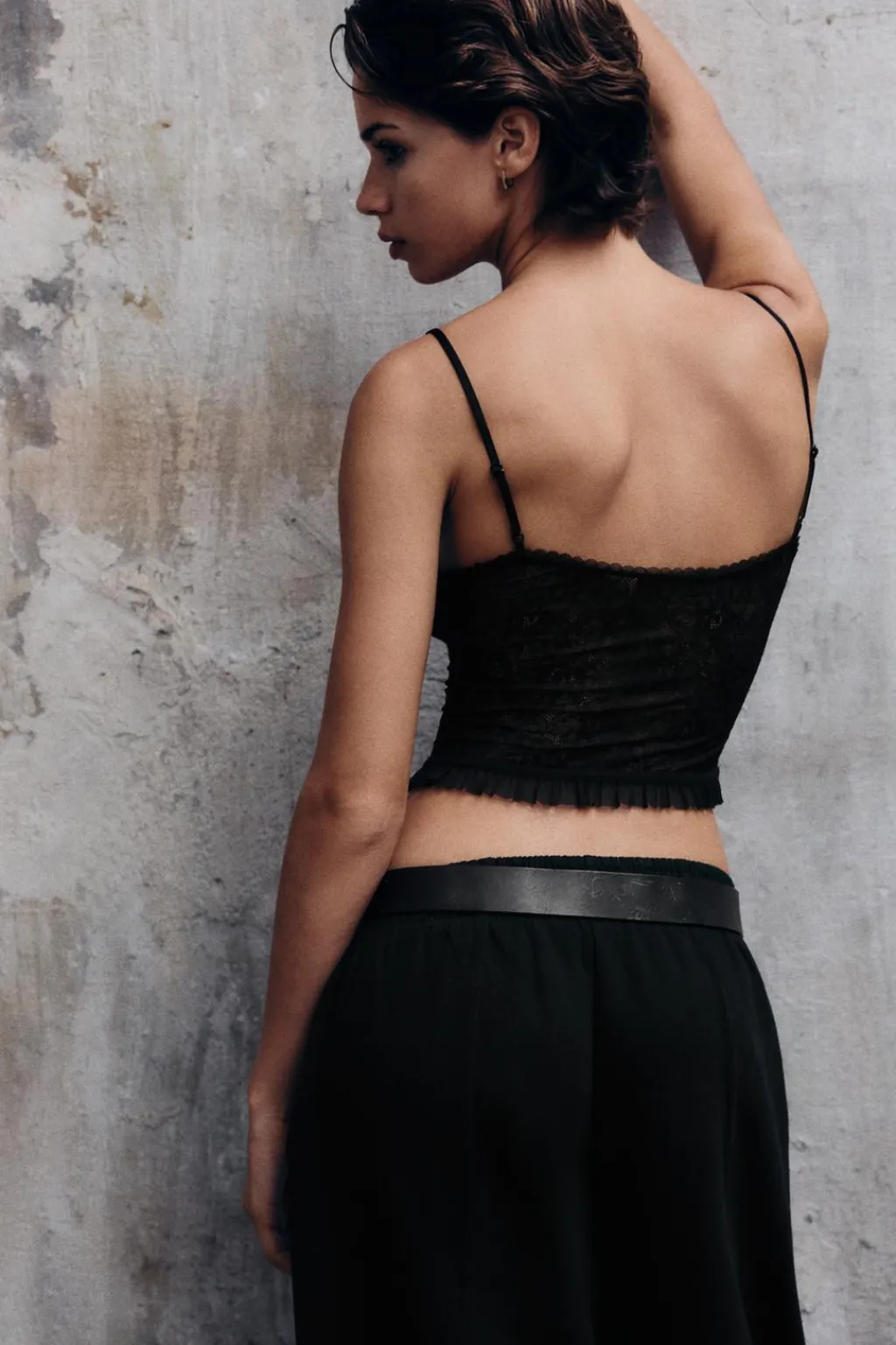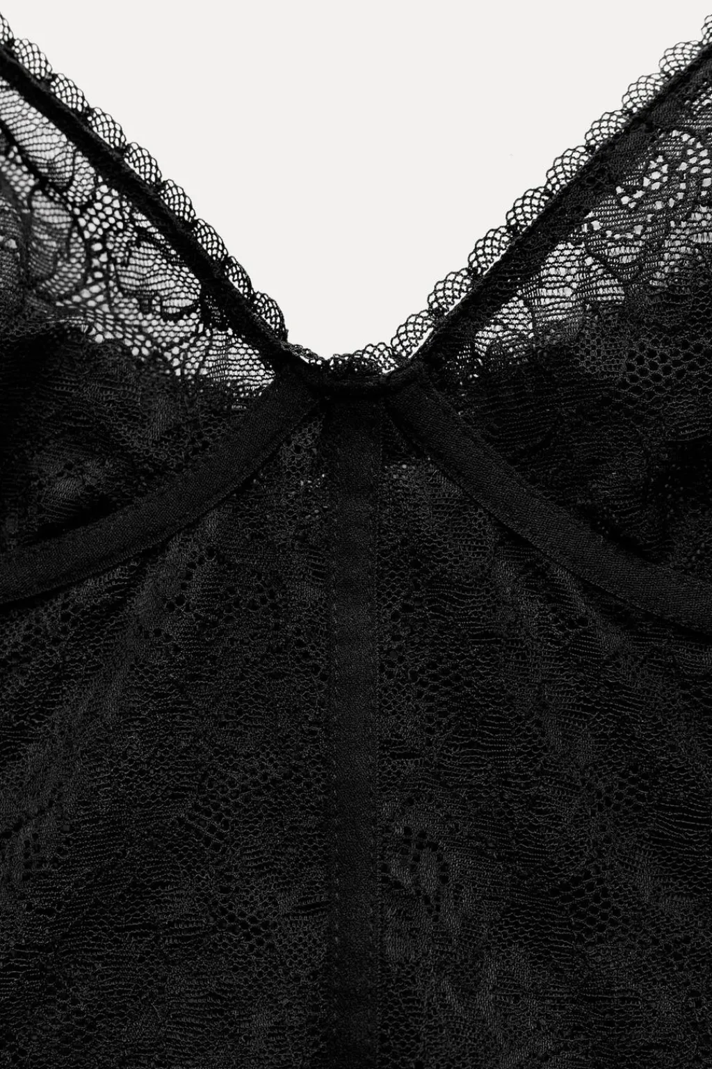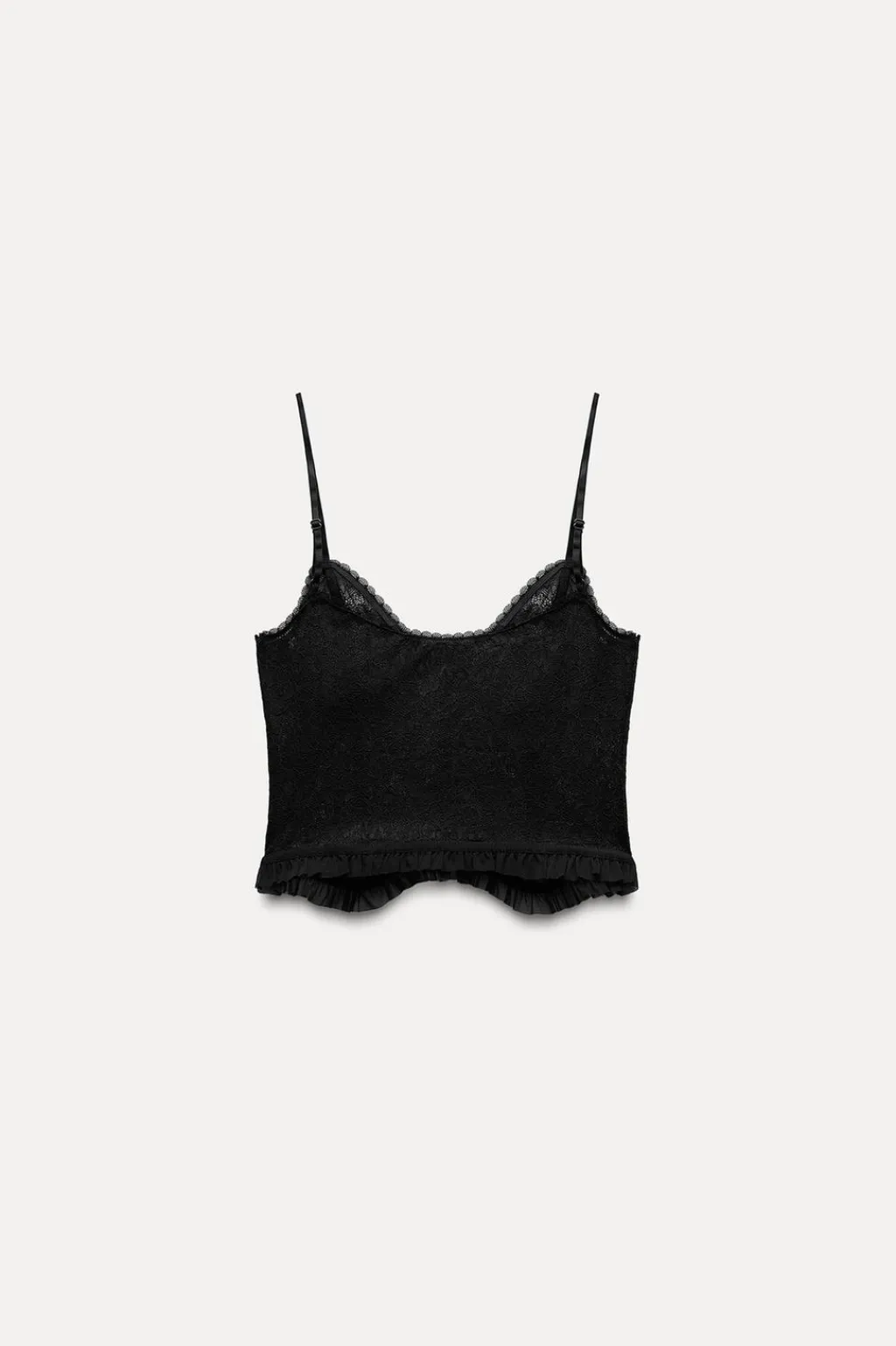 Top confeccionado en tejido tipo encaje. Escote corazón y tirantes finos ajustables. Bajo asimétrico en tejido a tono.