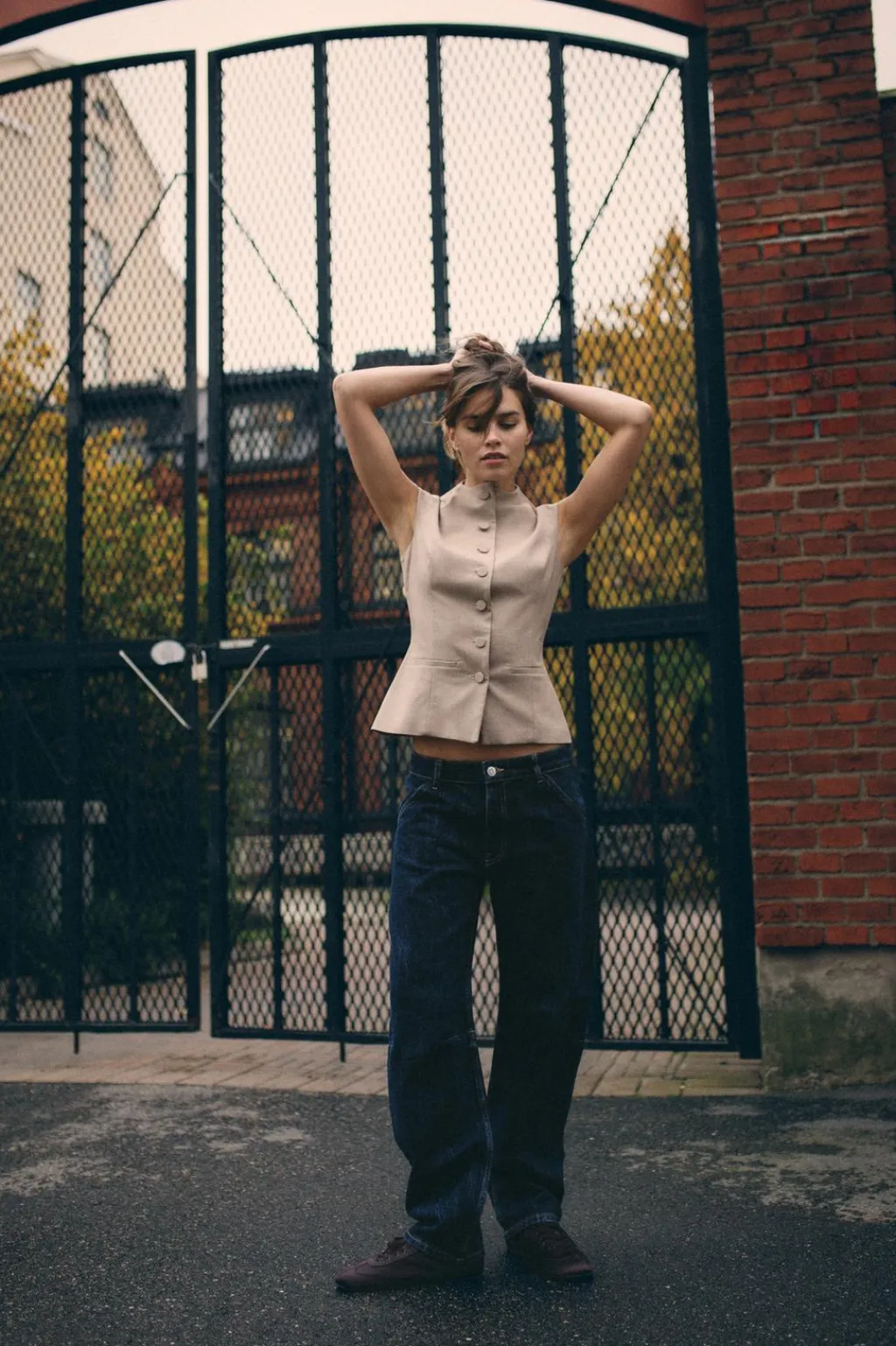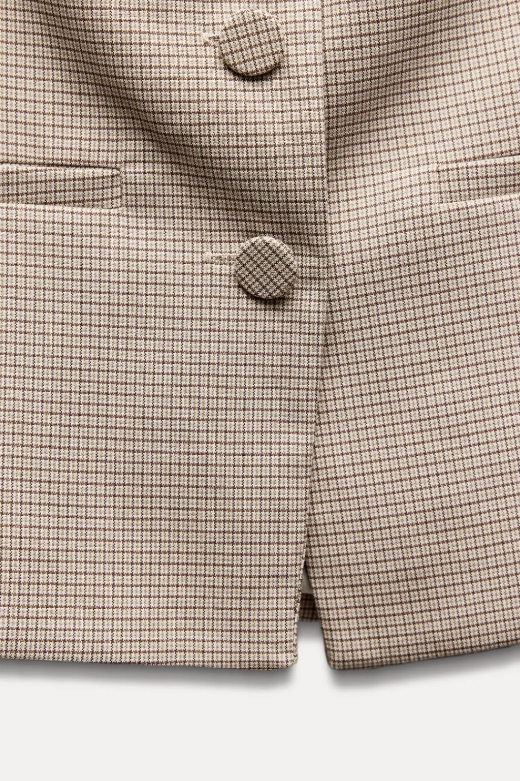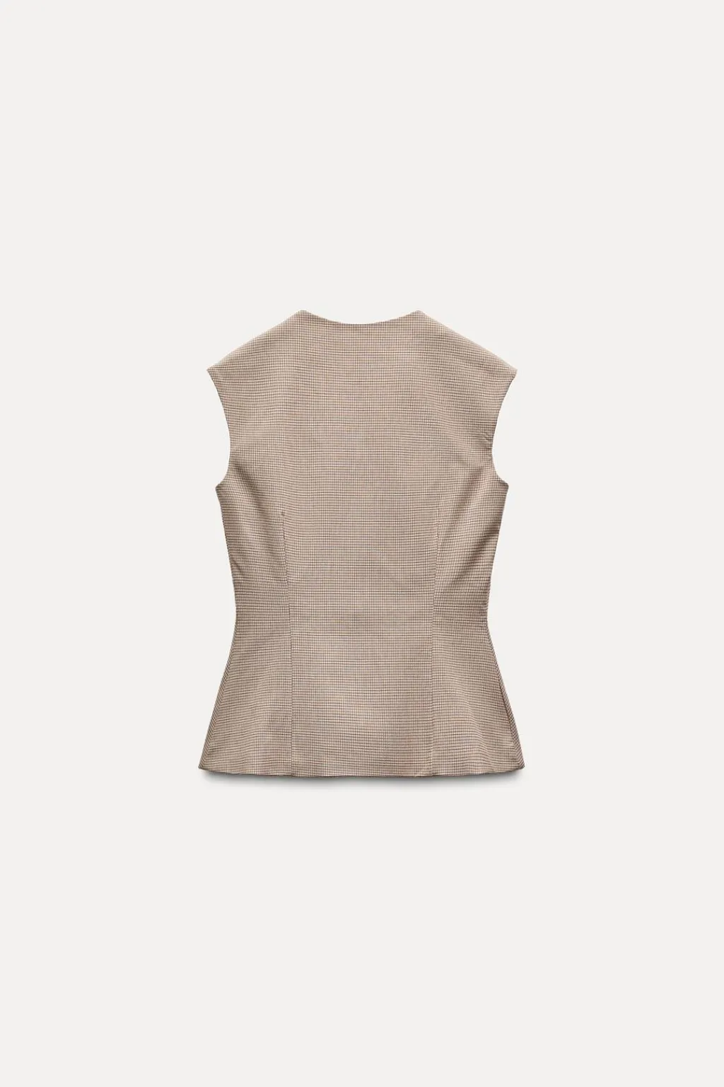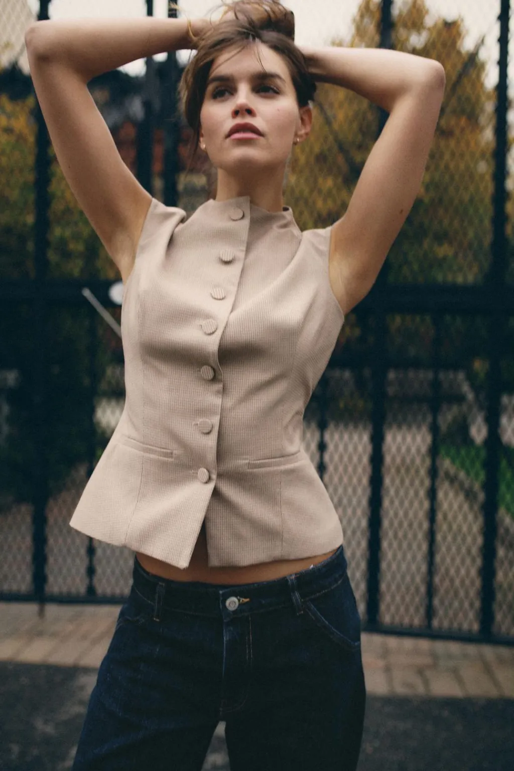 Top de cuello redondo y manga sisa. Falsos bolsillos de vivo en delantero. Forro interior combinado. Cierre frontal con botones forrados.