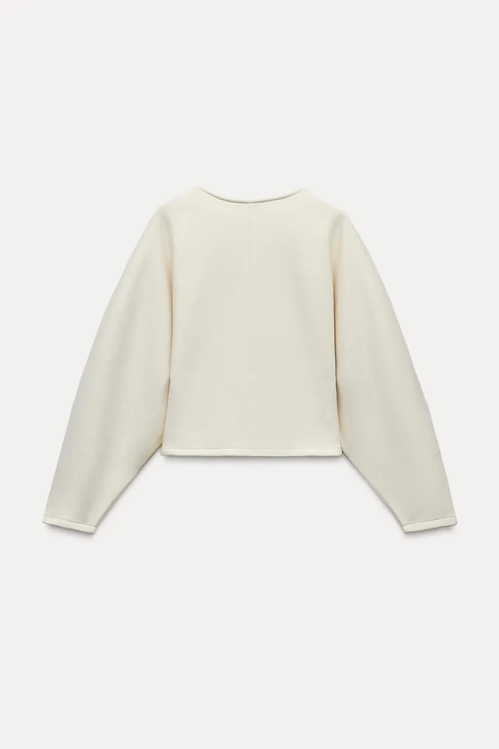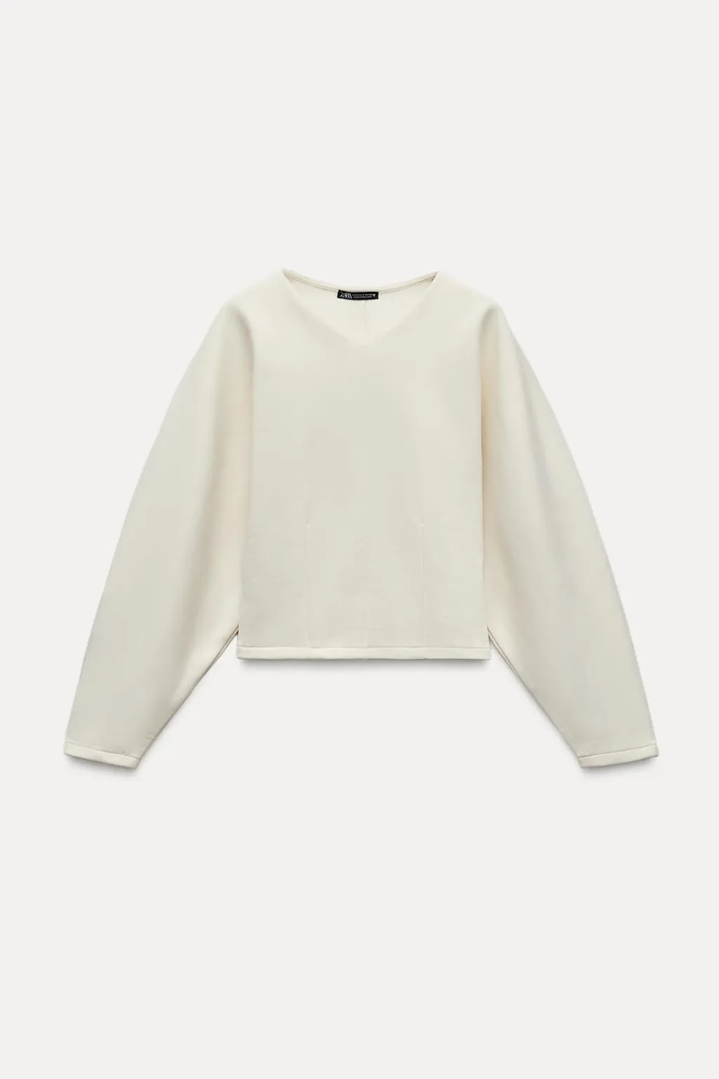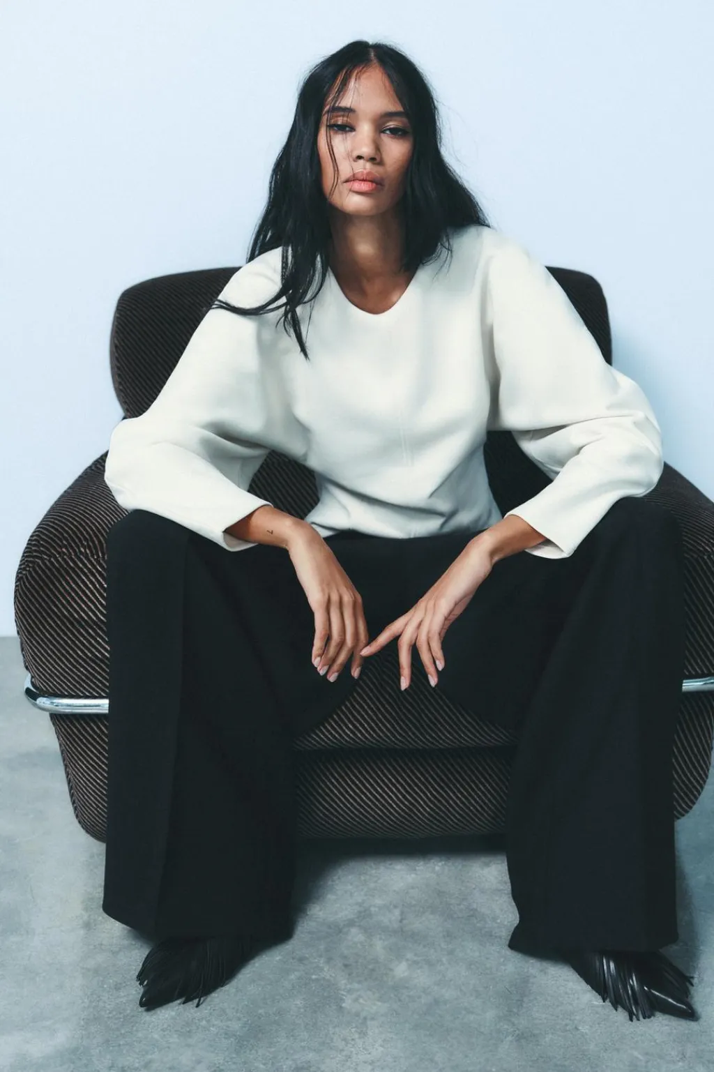 Top de cuello pico y manga larga. Cintura entallada. Cierre lateral con cremallera oculta en costura.