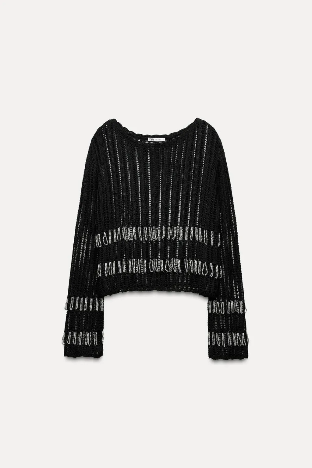 Top jersey semitransparente confeccionado en tejido tipo red. Cuello redondo y manga larga. Detalle aplicación abalorios combinados a contraste.