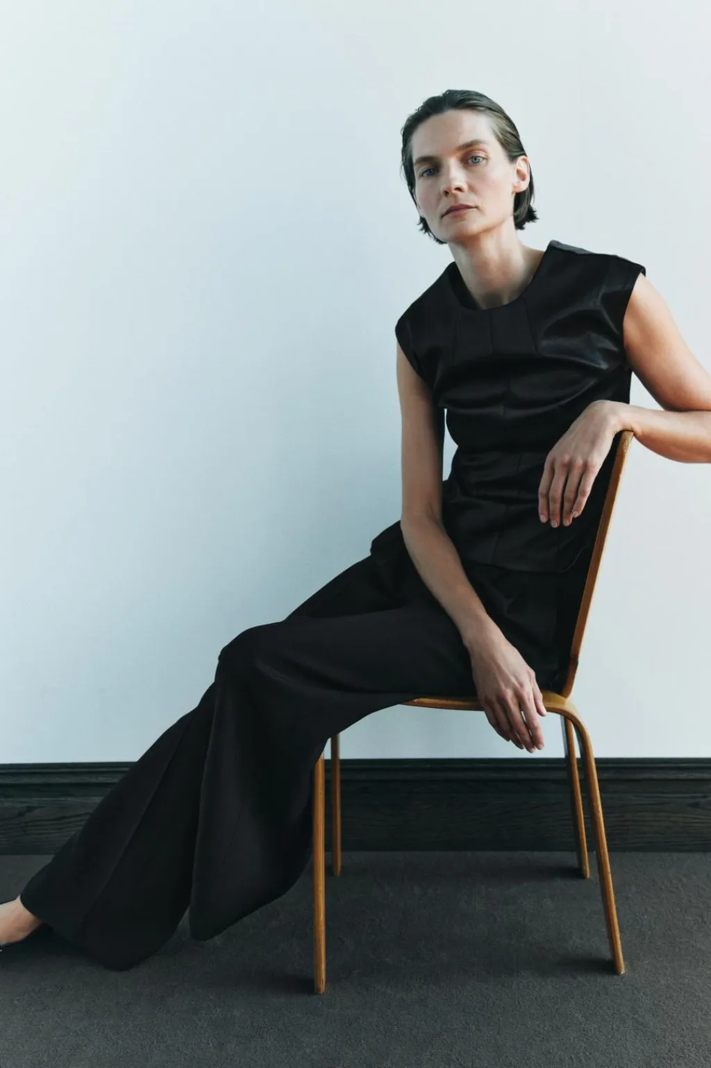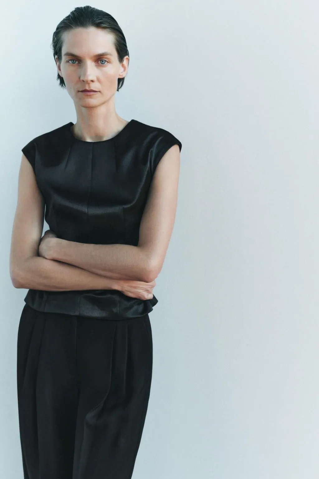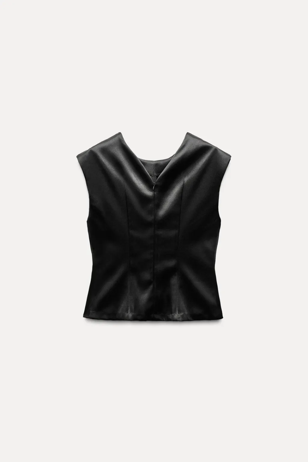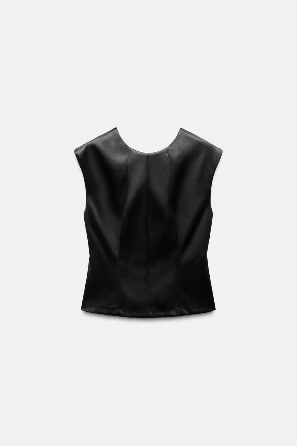 Top satinado de cuello redondo y manga sisa.