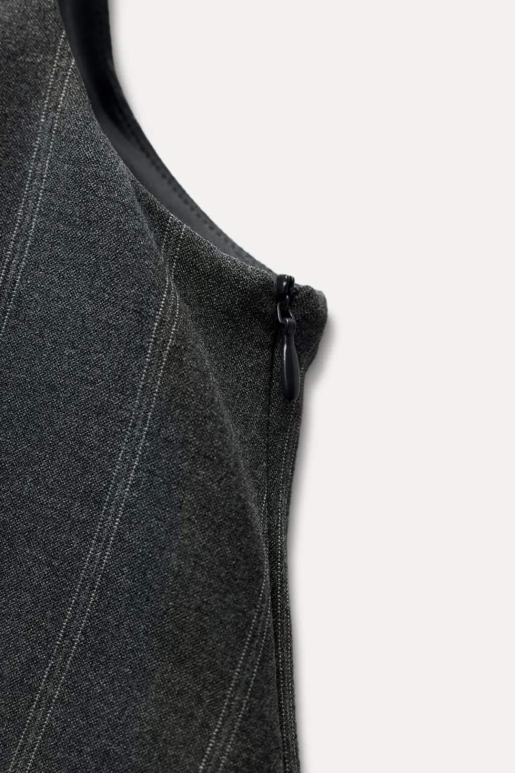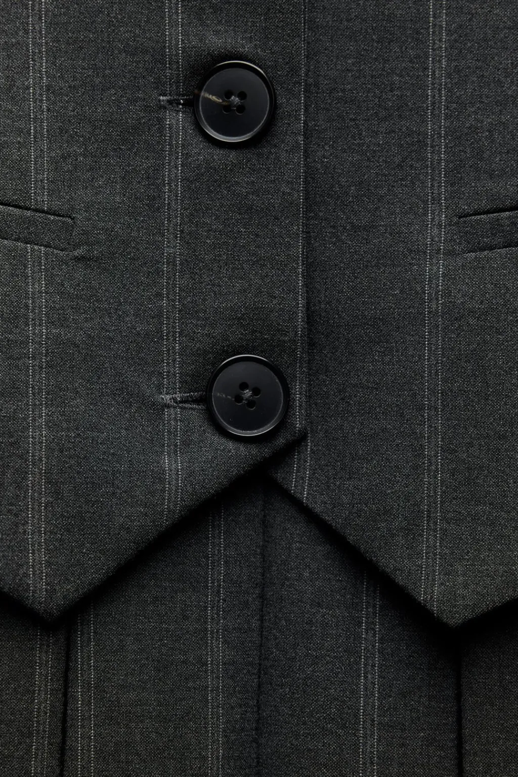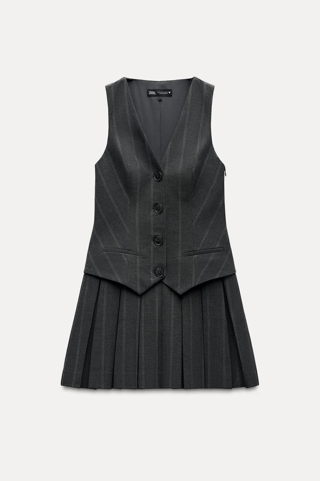 Vestido corto de escote pico y manga sisa. Falsos bolsillos de vivo en delantero. Detalle de trabilla en espalda. Bajo acabado en tablas. Forro interior. Cierre frontal con botones y lateral con cremallera oculta en costura.