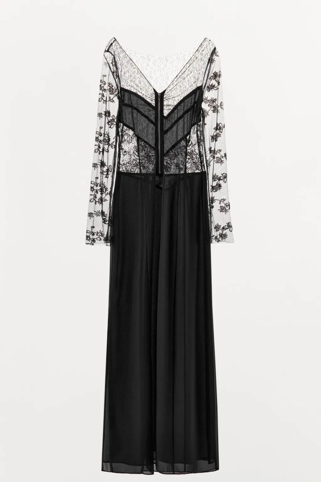 Vestido largo de cuello barco y manga larga. Detalle de encaje y aplicación de lentejuelas y abalorios combinados a tono. Forro interior. Cierre en espalda con cremallera metálica.