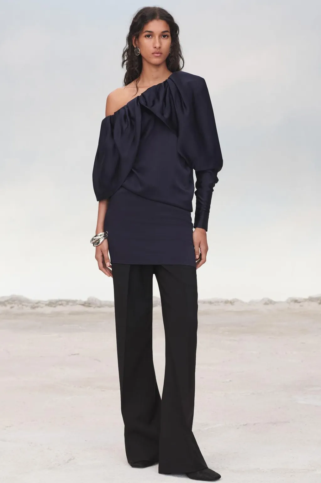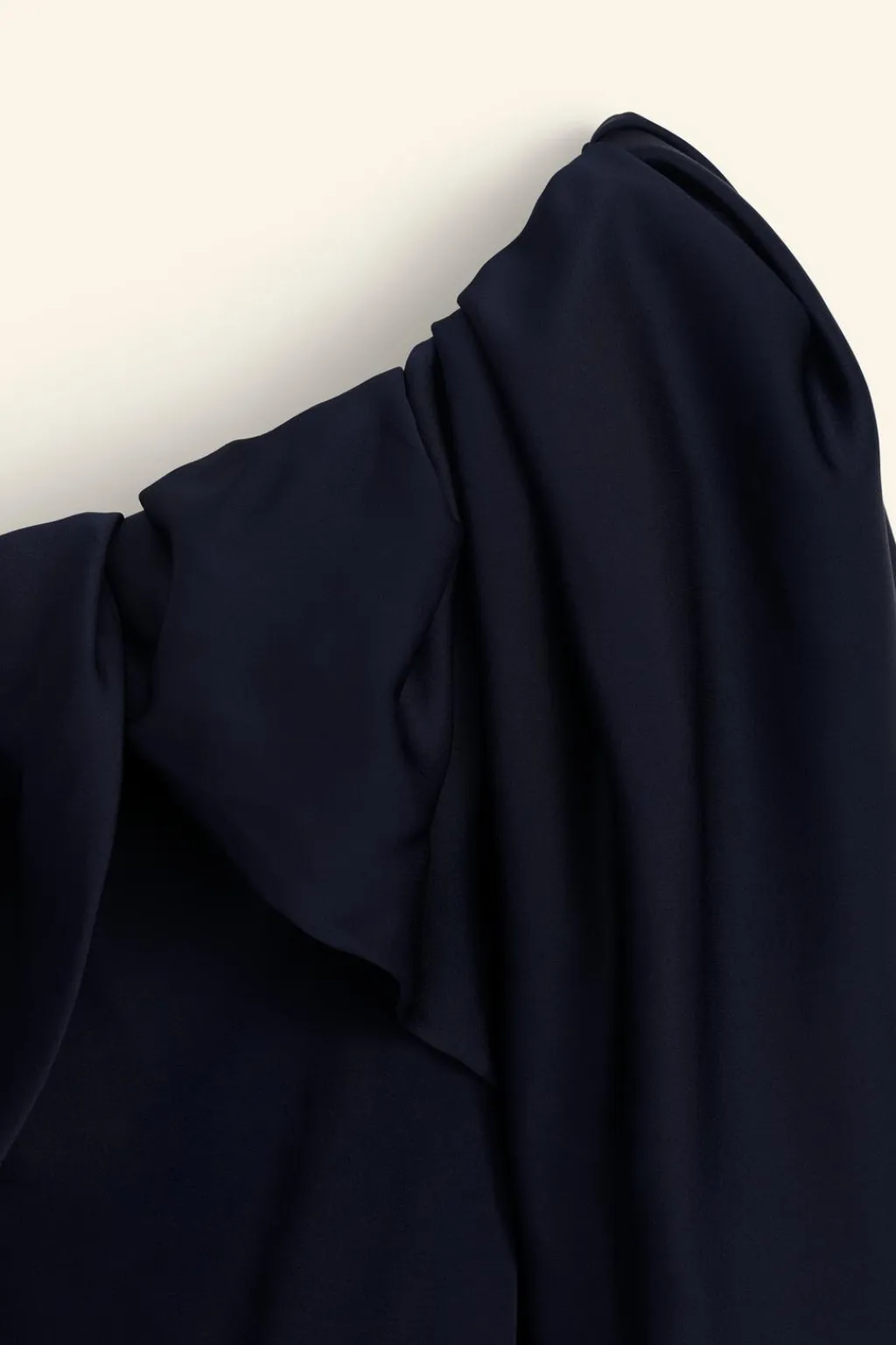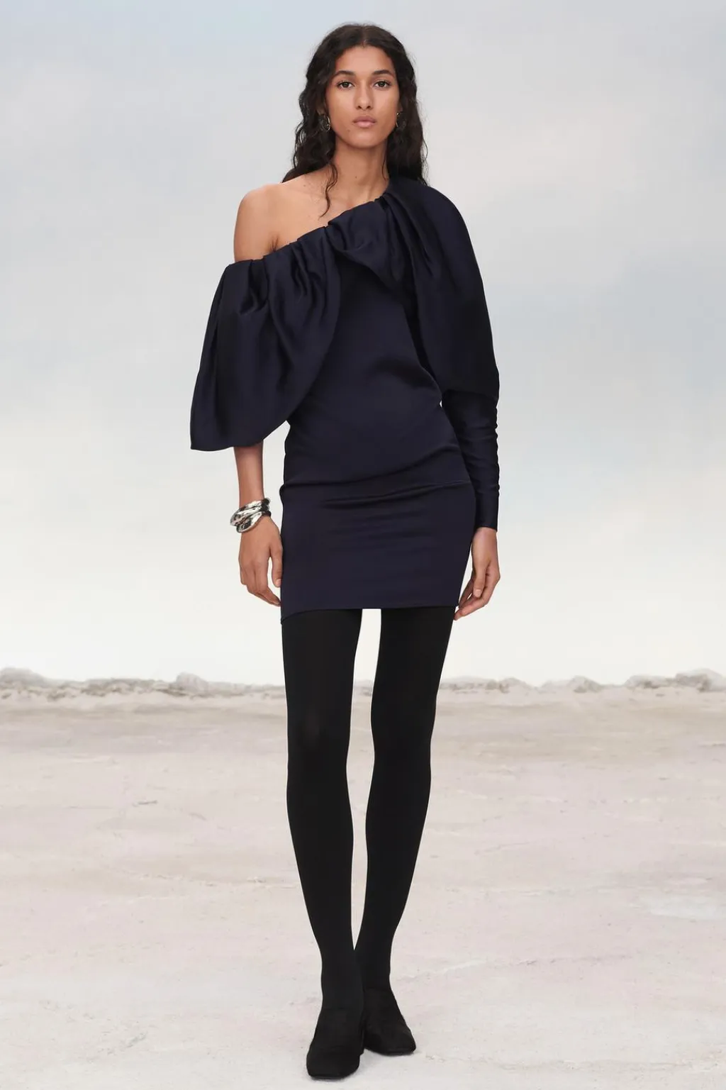 Vestido corto confeccionado en hilatura de algodón. Escote asimétrico y manga larga con cremallera oculta en costura. Detalle de superposición en mismo tejido tipo capa y drapeado lateral.