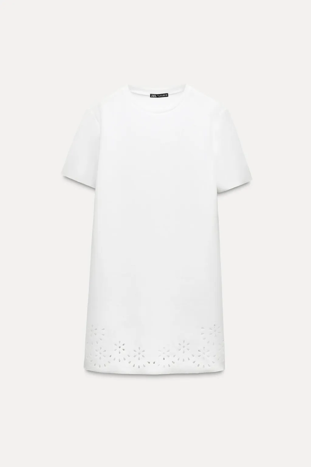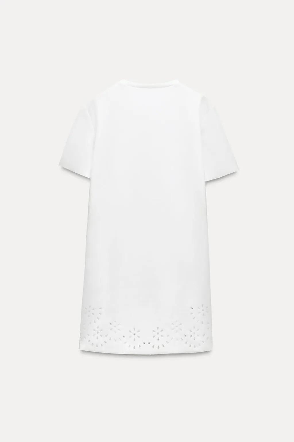 Vestido corto de cuello redondo y manga corta. Detalle de bordados perforados en bajo.