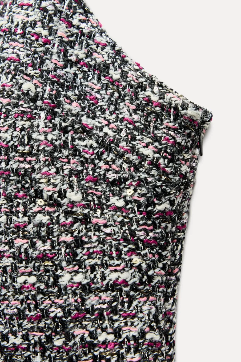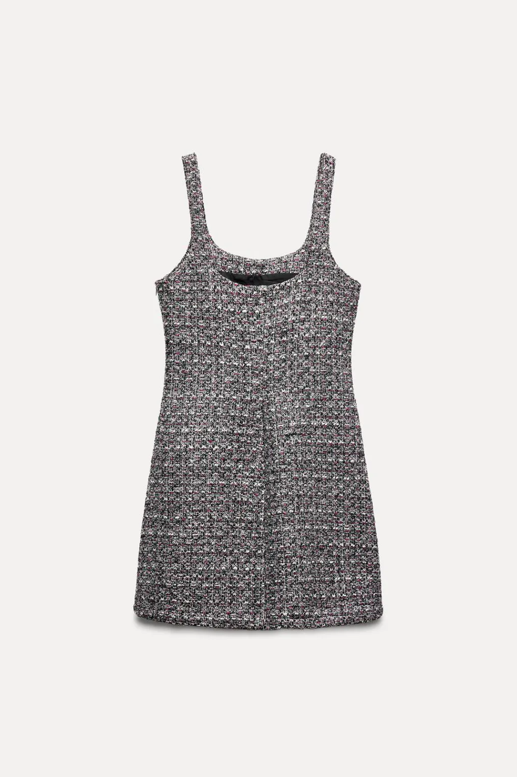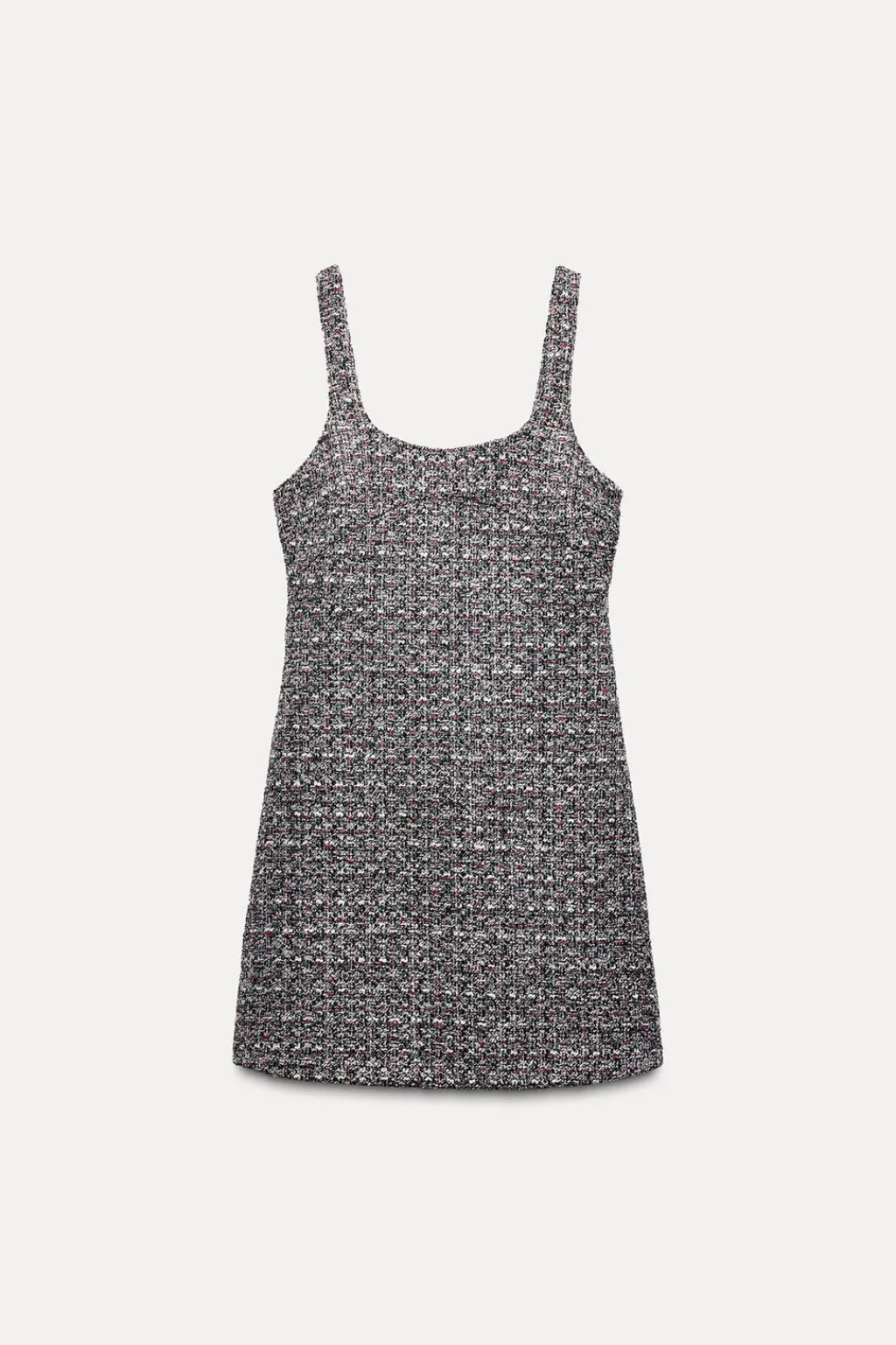 Vestido de escote recto y tirantes anchos. Cierre lateral con cremallera oculta en costura. Detalle de hilo metalizado y lentejuelas.