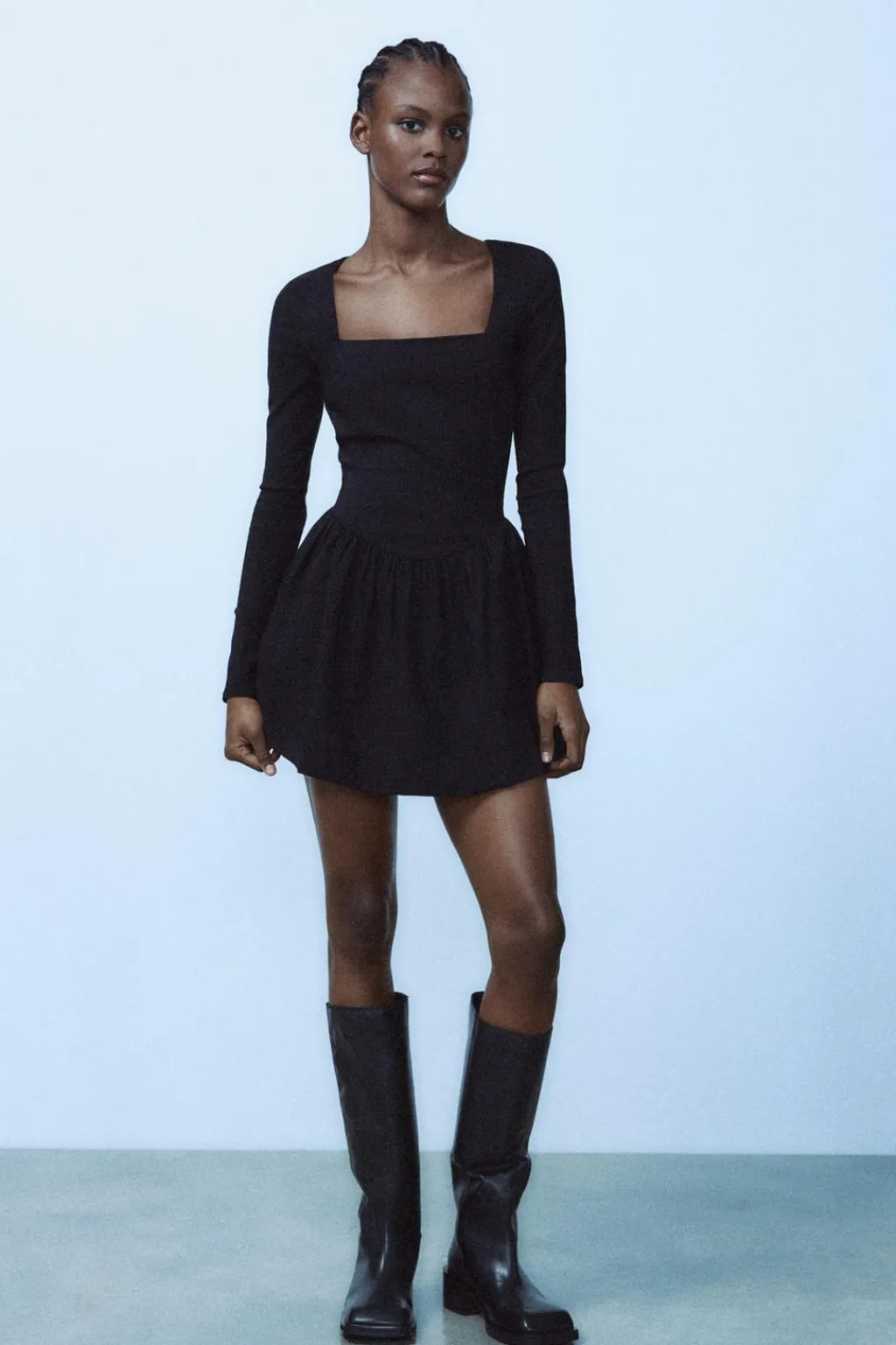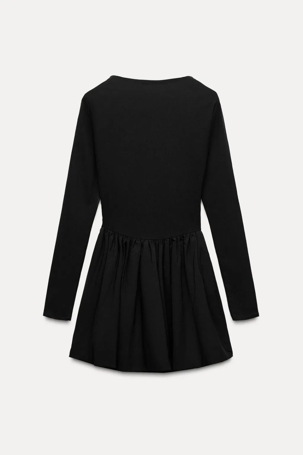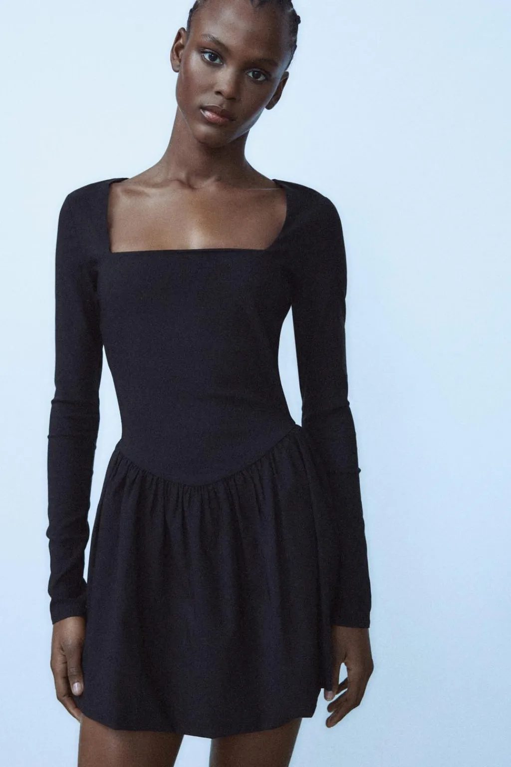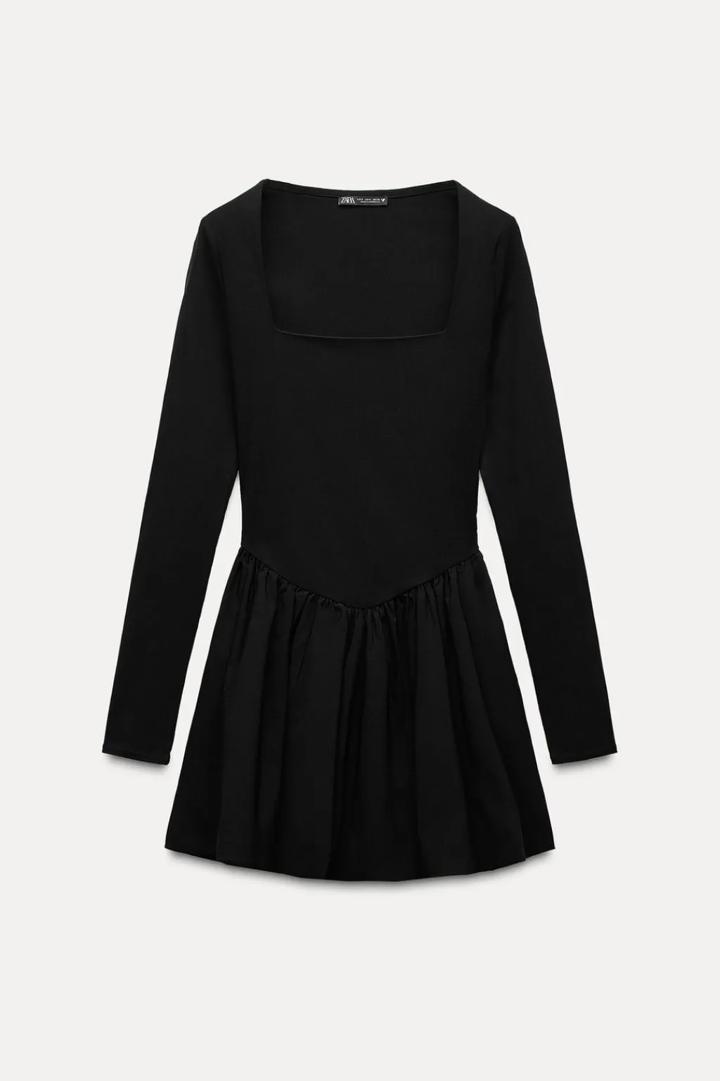 Vestido corto de escote cuadrado y manga larga. Bajo acabado tipo globo con detalle de pliegues.