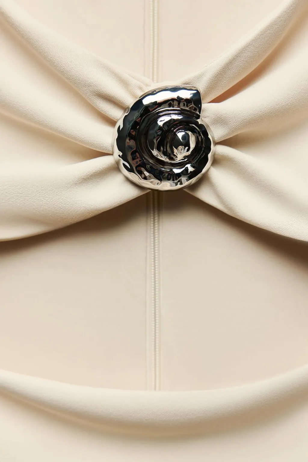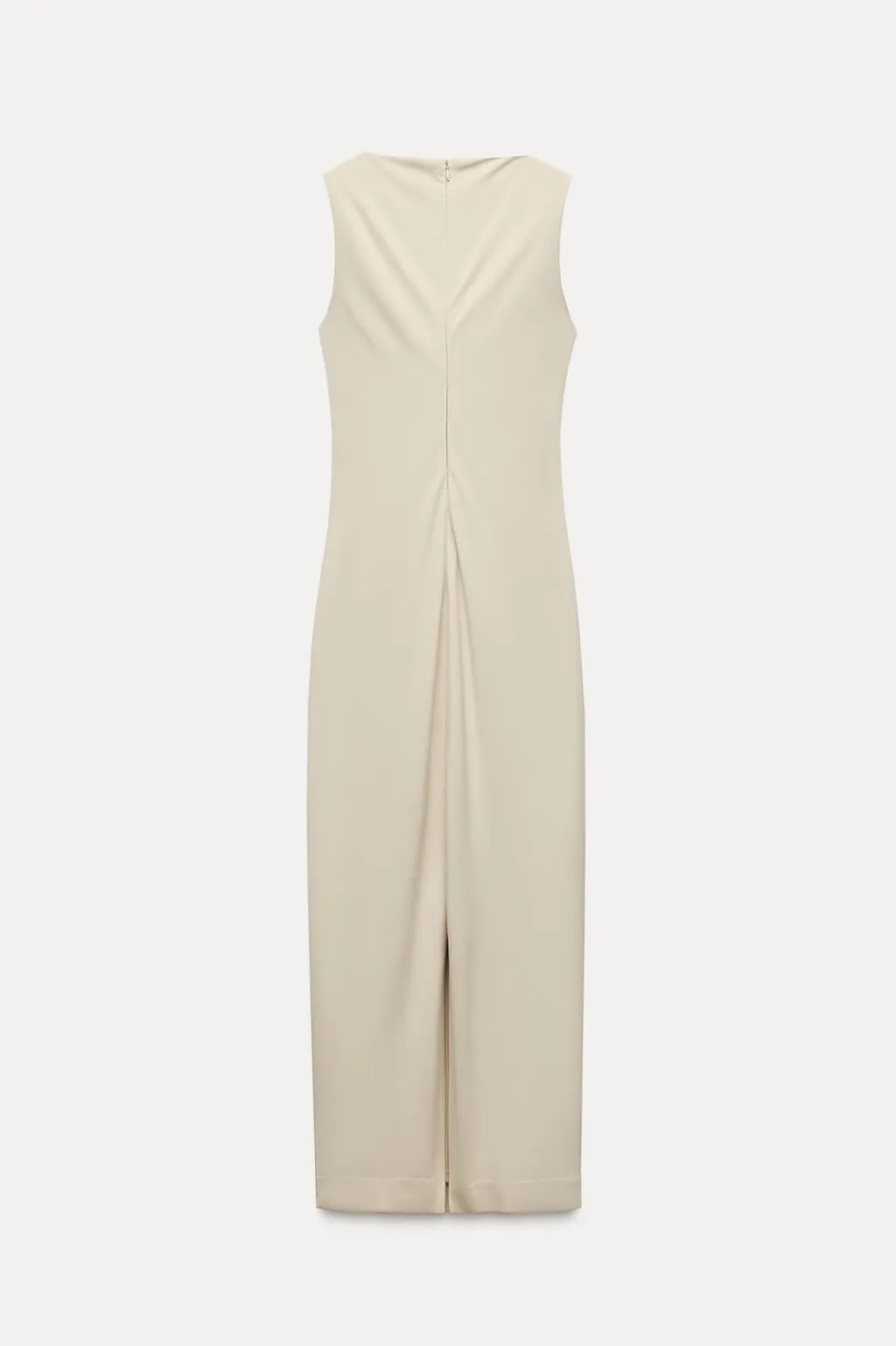 Vestido midi confeccionado en tejido tipo punto. Cuello redondo y manga sisa. Detalle de aberturas y aplicaciones metálicas en forma de caracola. Forro interior combinado a tono. Bajo con abertura en espalda. Cierre con cremallera oculta en costura.