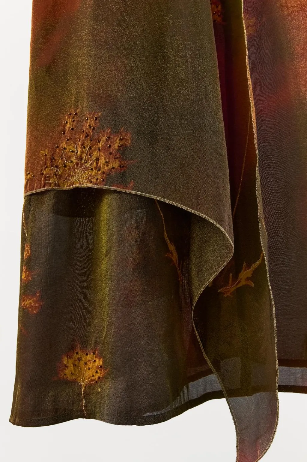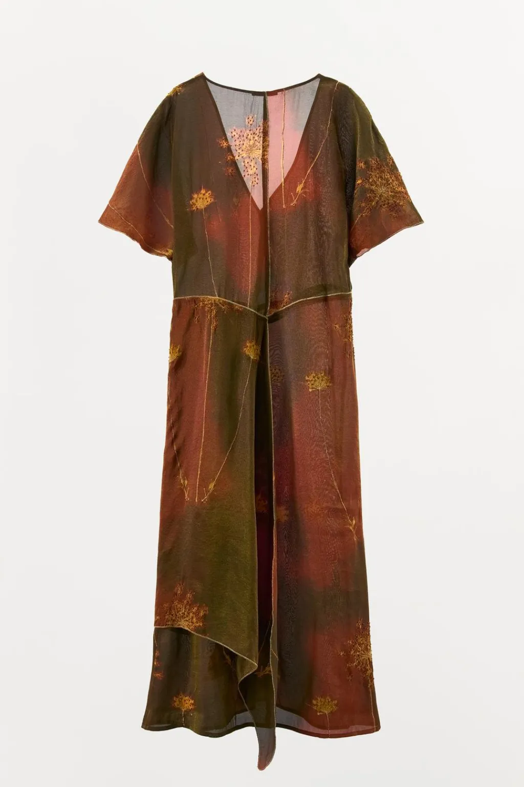 Vestido largo estilo kaftán confeccionado en hilatura con mezcla de viscosa. Escote pico y manga corta. Detalle de superposición en tejido y acabados con hilo metalizado a contraste. Aplicación de abalorios combinados a tono. Bajo acabado con abertura frontal.