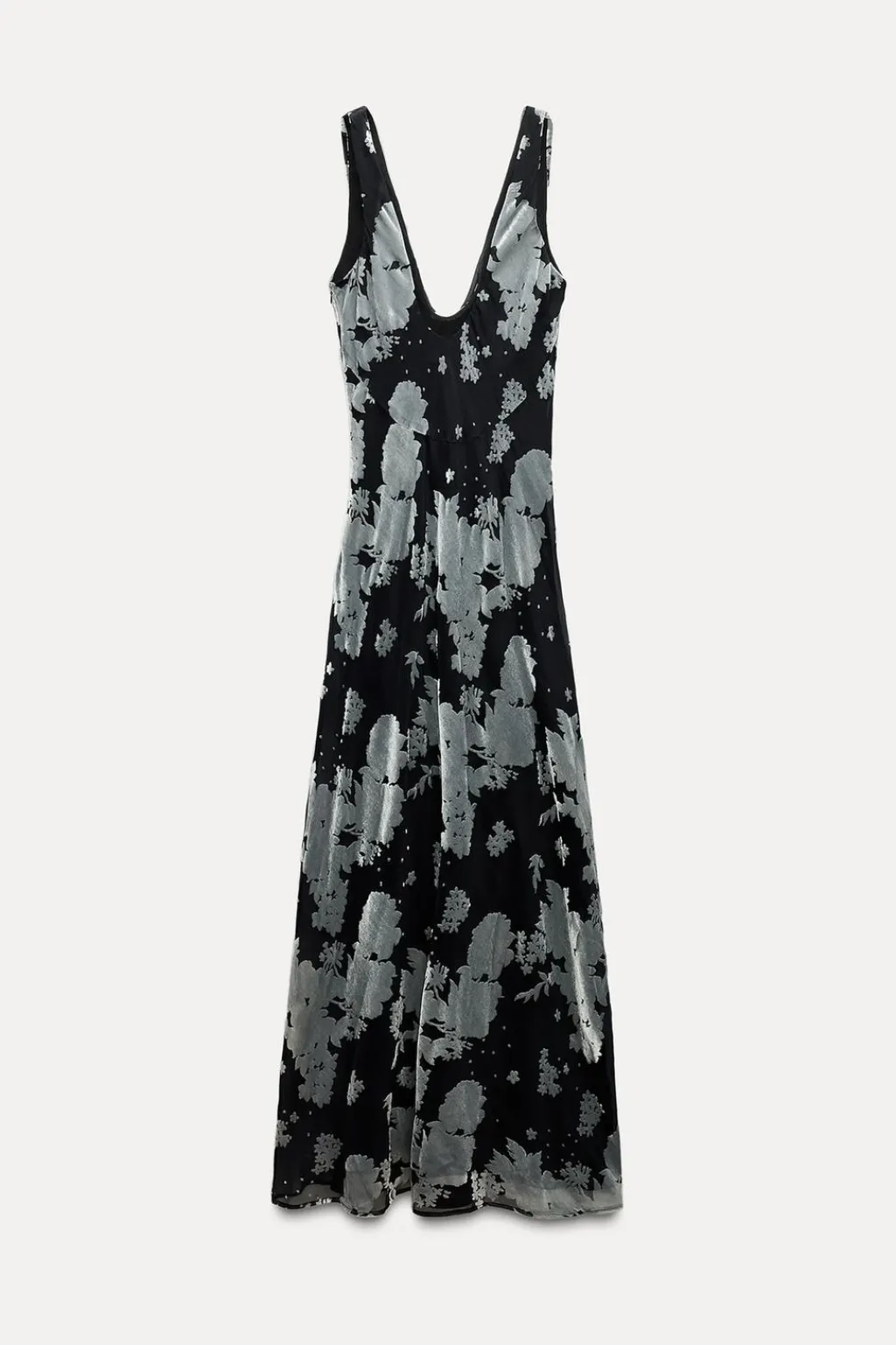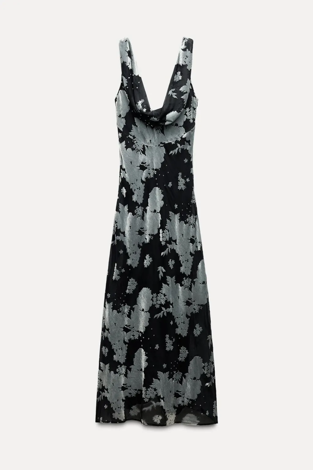 Vestido largo de escote drapeado y tirantes. Detalle de tejido combinado en terciopelo a contraste. Forro interior. Cierre lateral con cremallera oculta en costura.