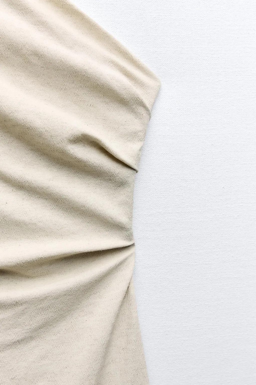 Vestido midi de escote asimétrico y manga larga. Detalle de tejido drapeado. Bajo acabado en abertura. Cierre con cremallera oculta en costura.