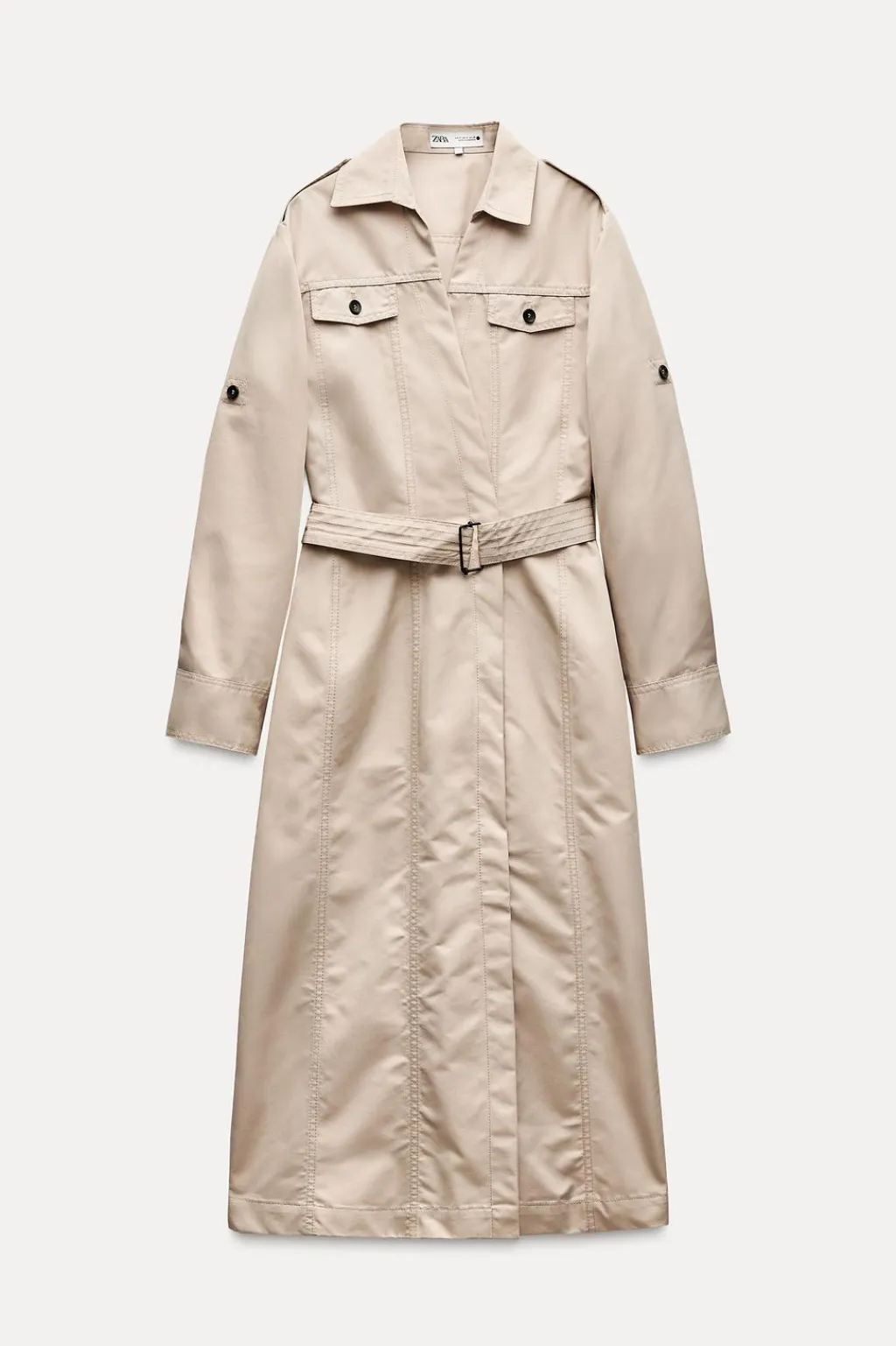 Vestido midi confeccionado en hilatura con algodón. Cuello solapa y manga larga acabada en puño ajustable con trabilla y botón. Bolsillos con solapa y botón en delantero. Cinturón en mismo tejido ajustable con hebilla. Cierre frontal con botones ocultos.
