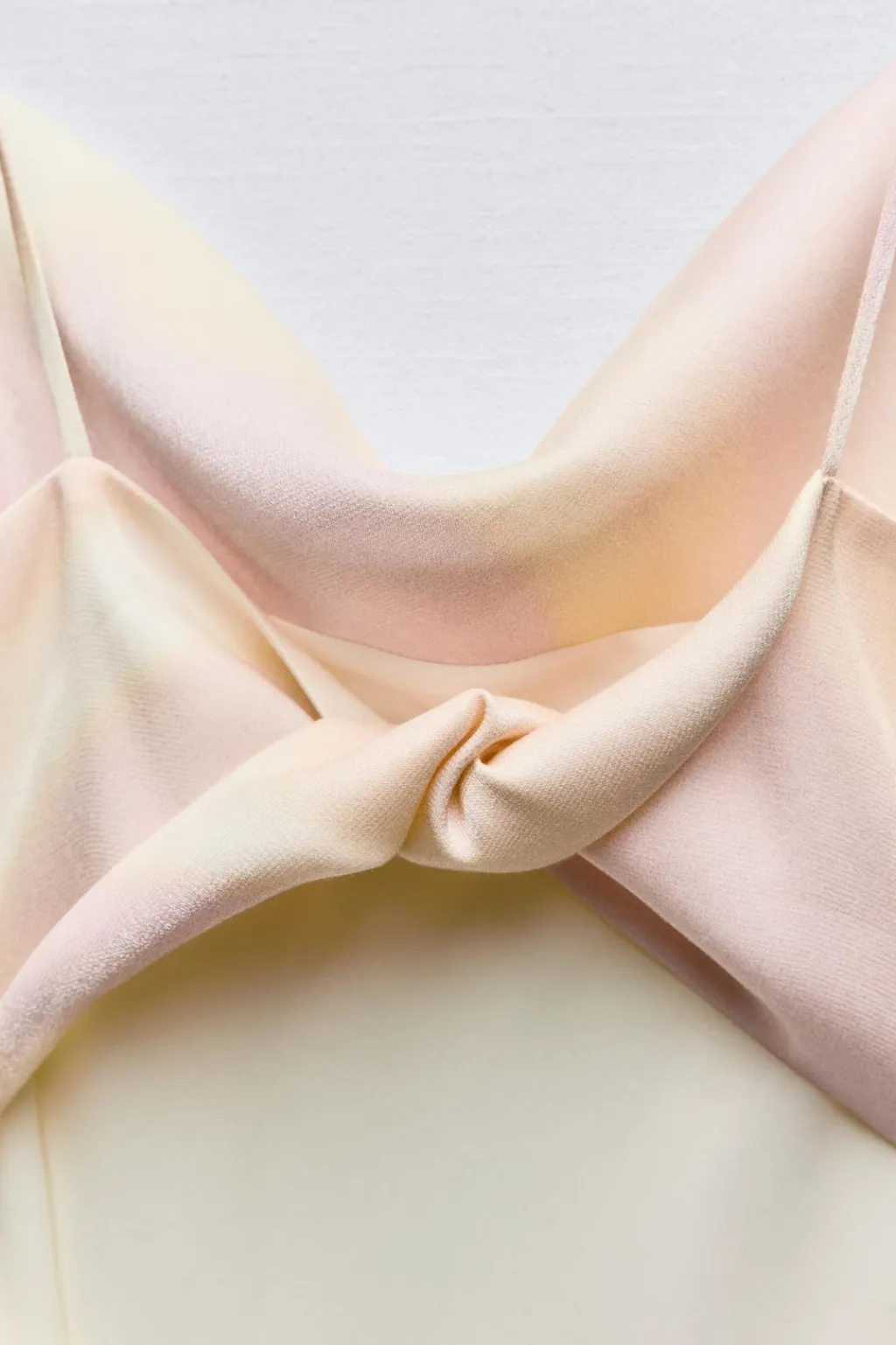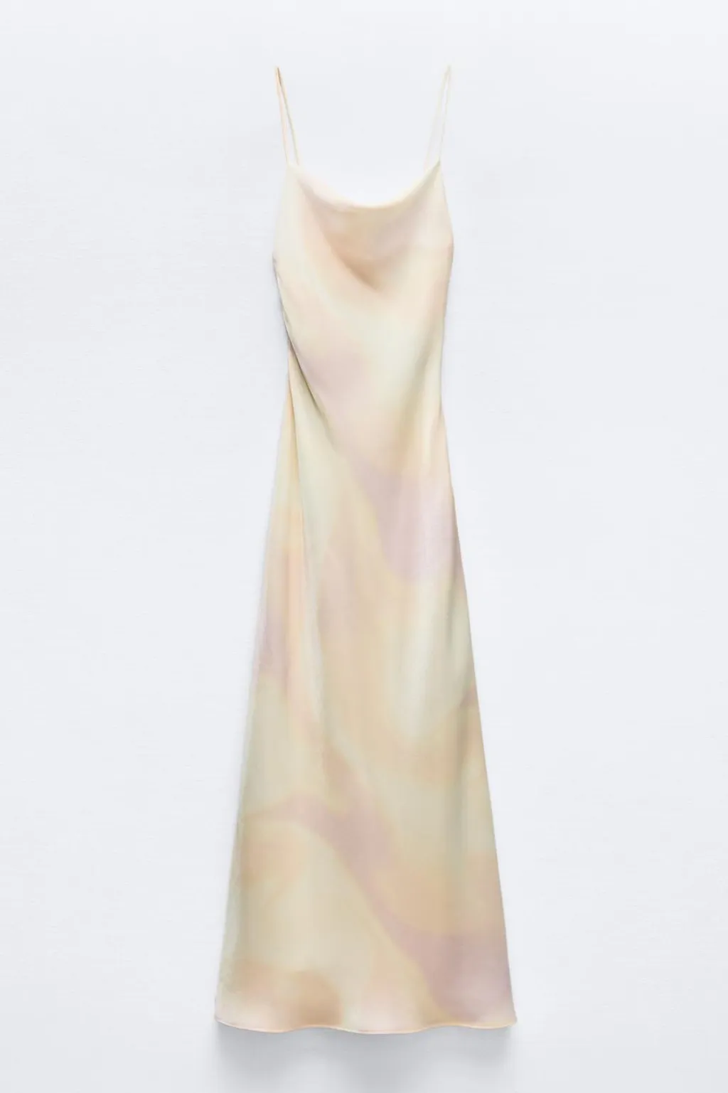 Vestido midi de escote fluido y tirantes finos. Espalda con abertura y tira con torsión. Forro interior combinado. Cierre lateral con cremallera oculta en costura.