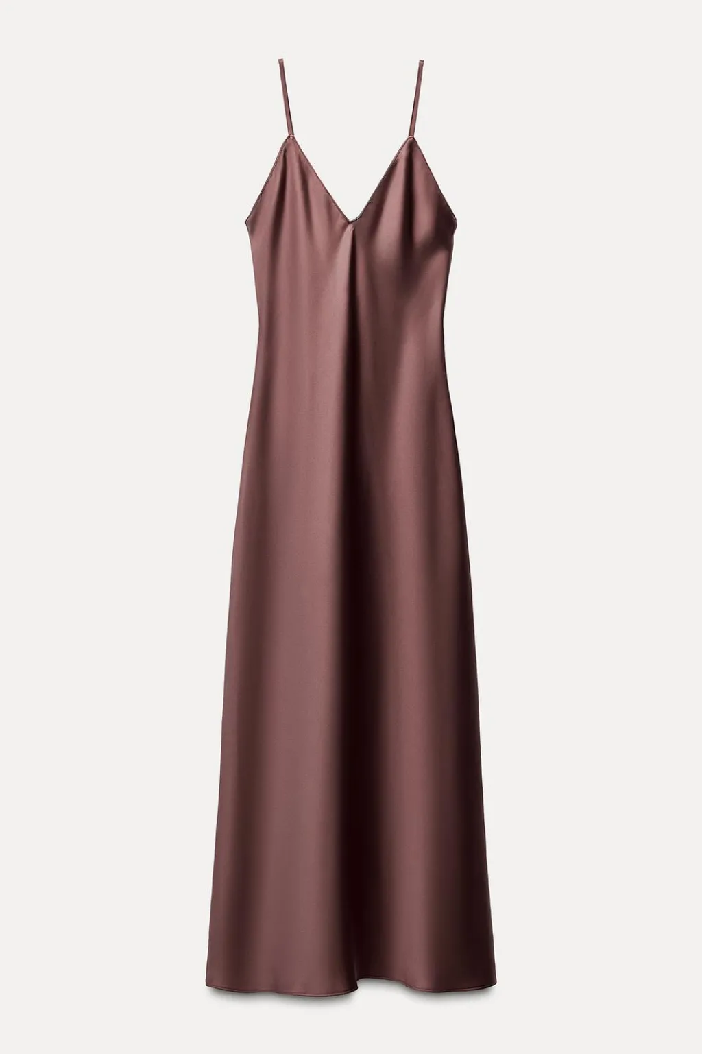 Vestido midi confeccionado en tejido satinado. Escote pico y tirantes finos ajustables. Cierre en espalda con cremallera oculta en costura.