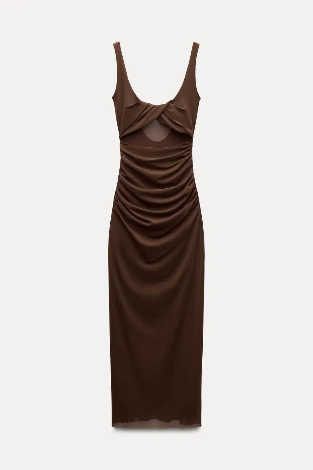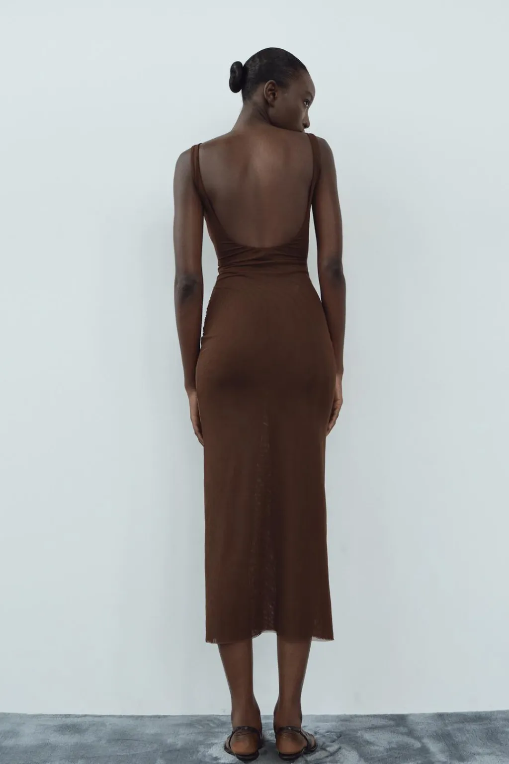 Vestido midi semitransparente de escote redondo y tirantes. Forro interior combinado a tono. Detalle de nudo en pecho y frunces laterales.