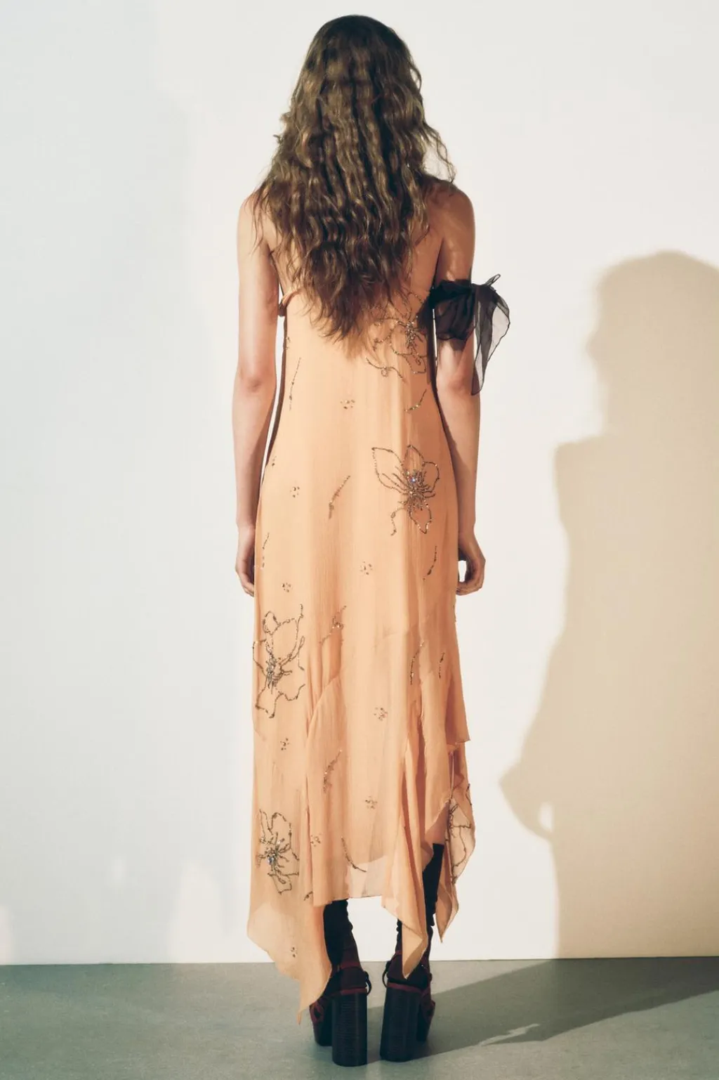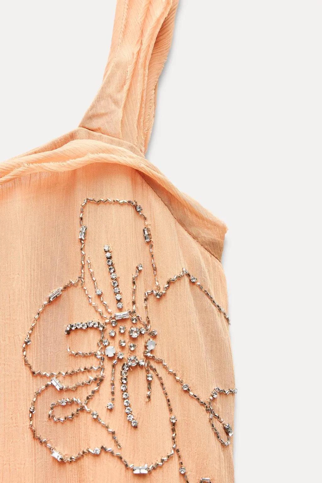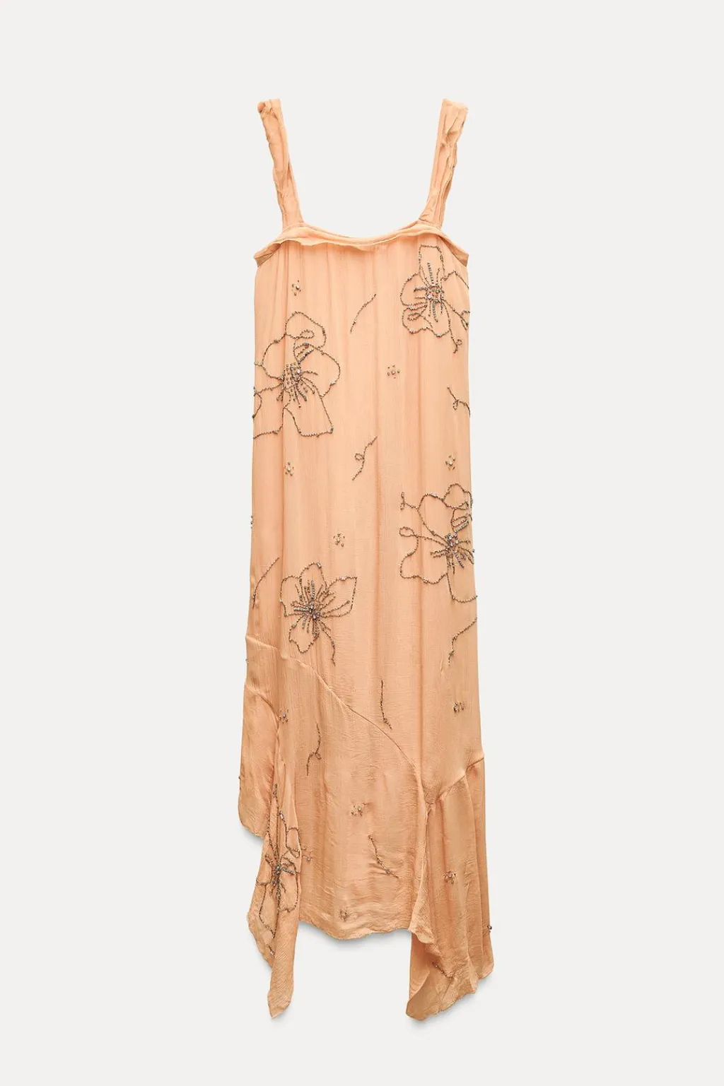 Vestido midi confeccionado en hilatura de viscosa. Escote recto y tirantes anchos. Detalle de bordados con aplicación de abalorios. Forro corto interior. Bajo asimétrico.