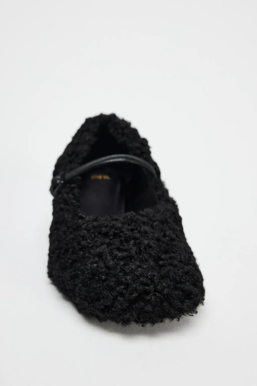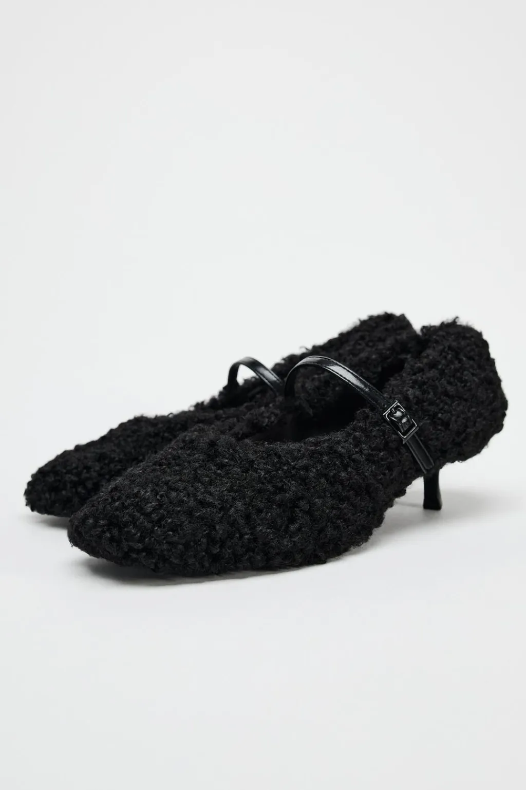 Zapato con tacón fino. Efecto borreguito. Tira con hebilla ajustable en el empeine. Acabado en punta redonda.