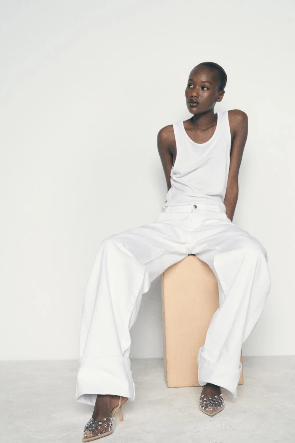 Zapato de tacón alto destalonado en vinilo con detalle de brillos. Tira trasera con elástico. Acabado en punta.